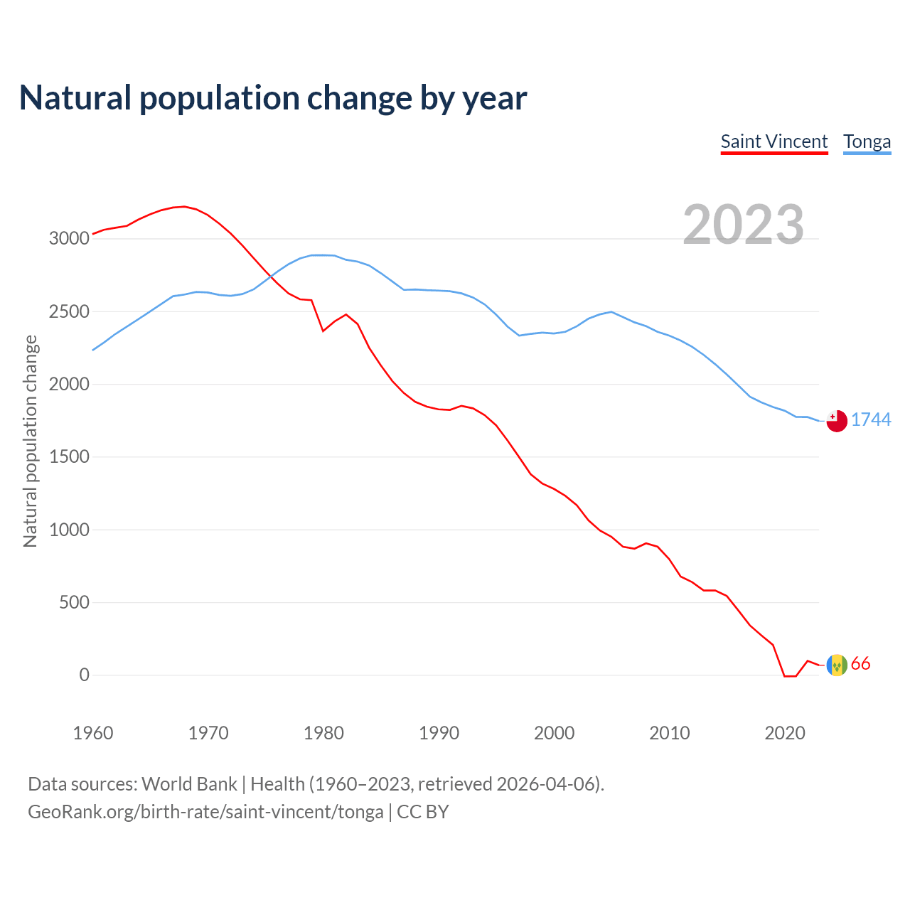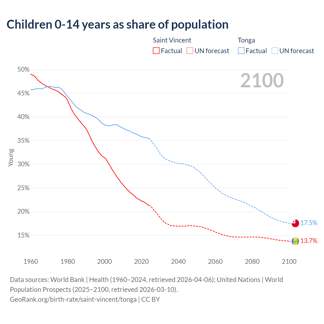 According to the latest available data on birth rates, the fertility rate in Saint Vincent was 1.78 children per woman in 2023, compared to 3.13 in Tonga in 2023. The replacement level is considered to be 2.1 children per woman.