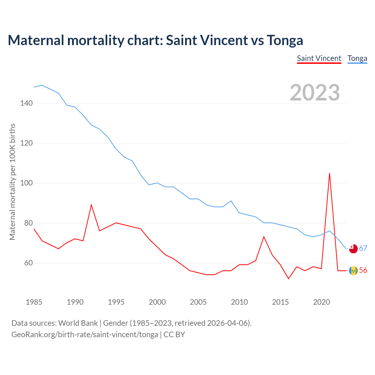 The maternal mortality rate, which is the probability of dying during childbirth or within 42 days of pregnancy termination, is 56 deaths per 100,000 live births in Saint Vincent, compared to 67 deaths in Tonga.