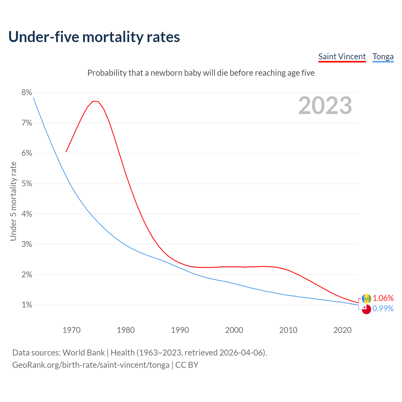 The chance that a newborn baby will die before reaching age five is 1.06% in Saint Vincent and 0.99% in Tonga. Above is a chart with historical data on under-five mortality rates.