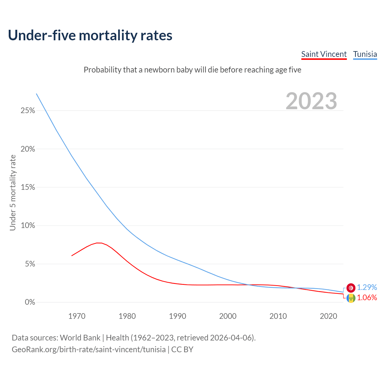 The chance that a newborn baby will die before reaching age five is 1.06% in Saint Vincent and 1.29% in Tunisia. Above is a chart with historical data on under-five mortality rates.