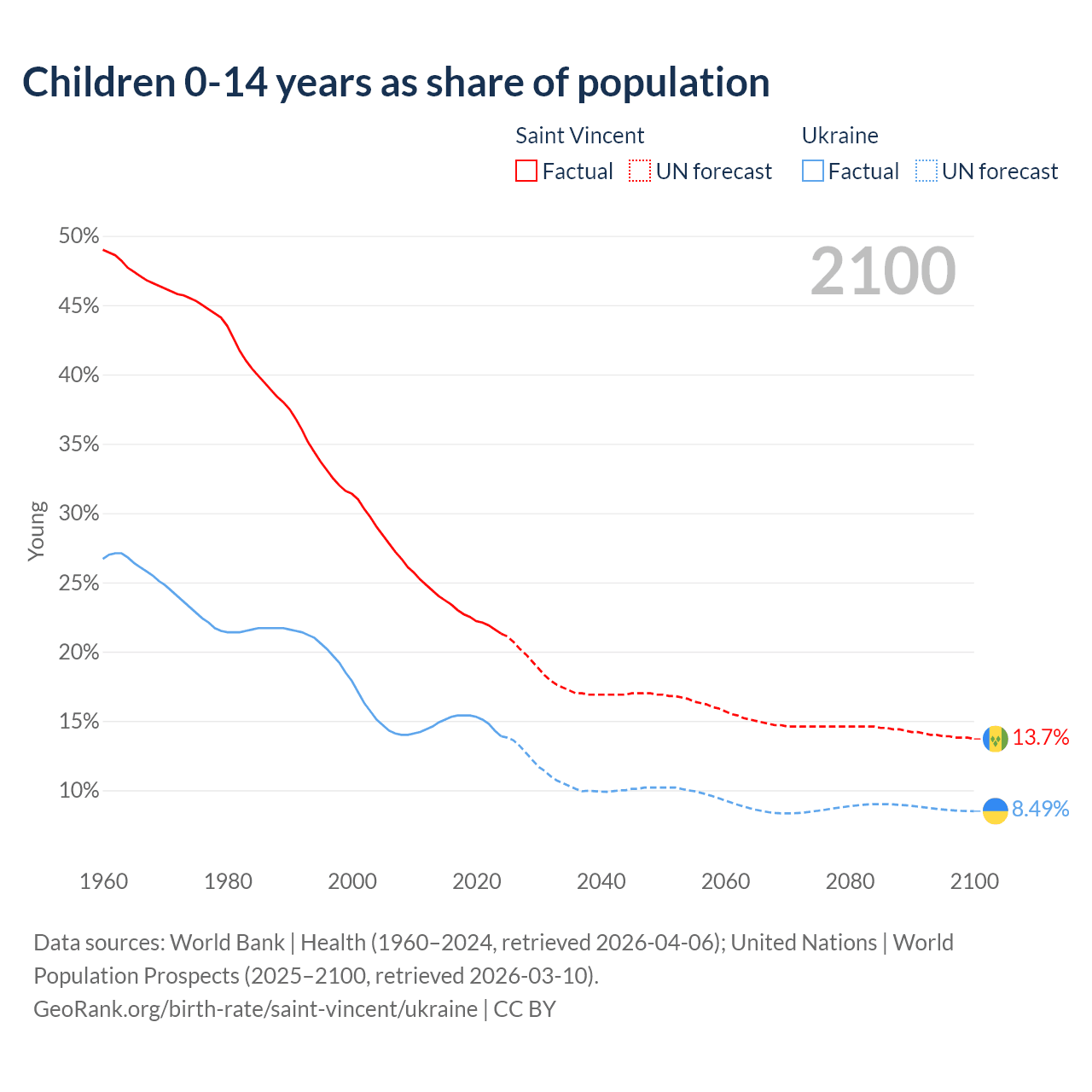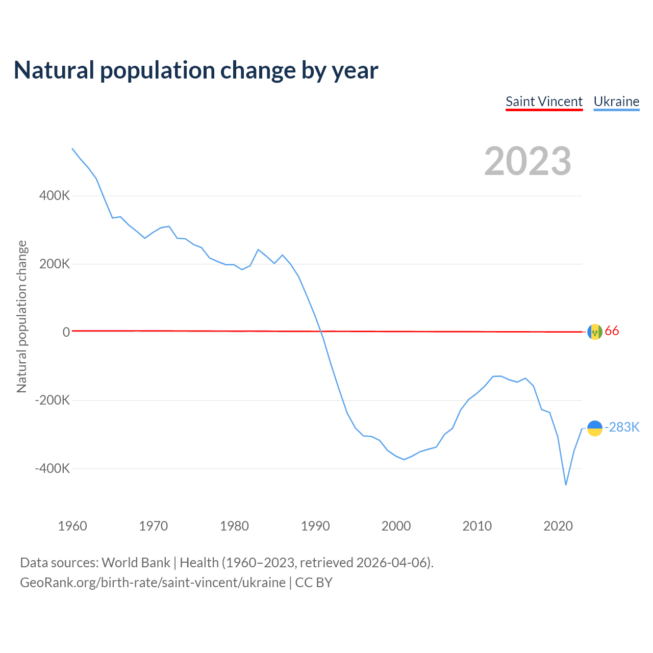 According to the latest available data on birth rates, the fertility rate in Saint Vincent was 1.78 children per woman in 2023, compared to 0.98 in Ukraine in 2023. The replacement level is considered to be 2.1 children per woman.