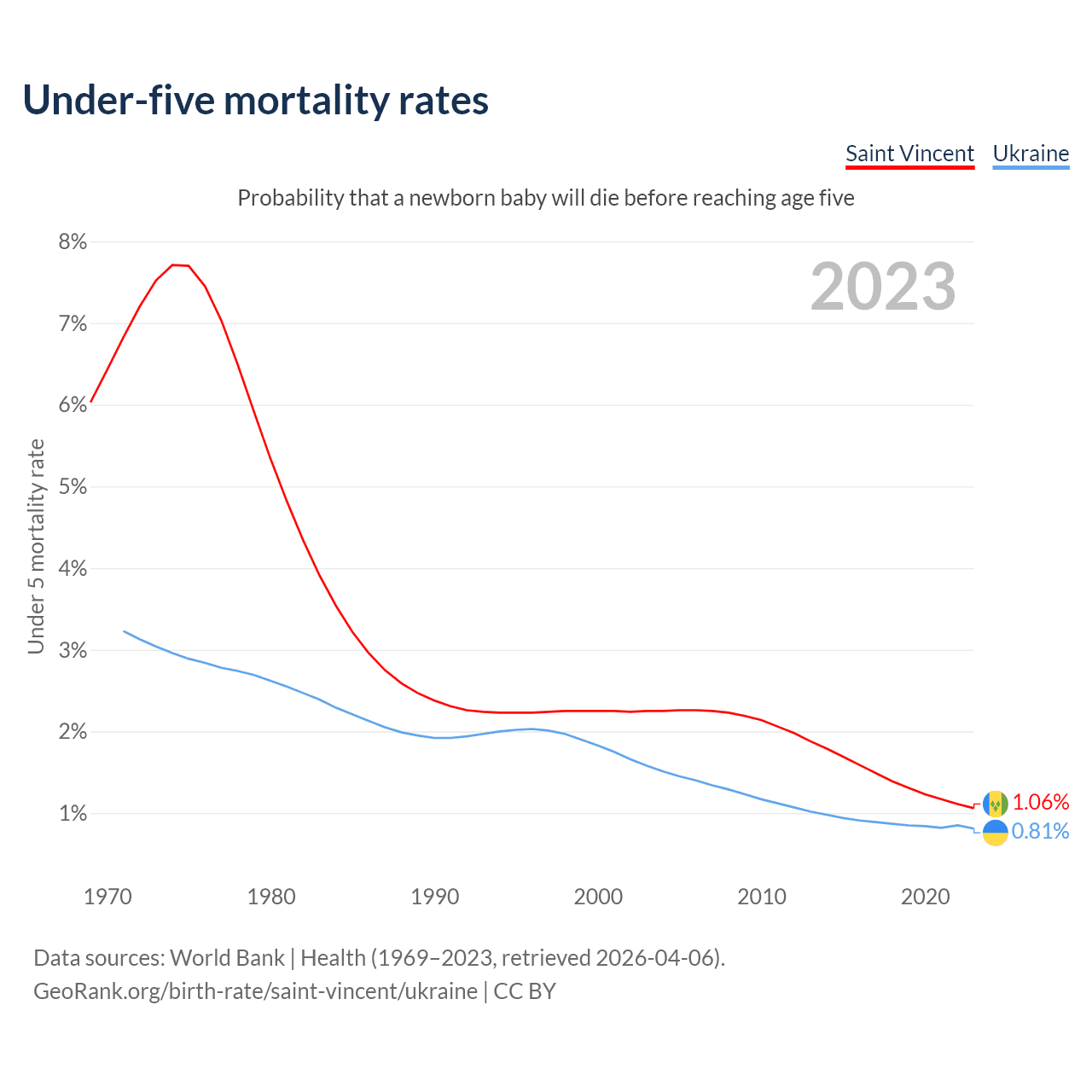 The chance that a newborn baby will die before reaching age five is 1.06% in Saint Vincent and 0.81% in Ukraine. Above is a chart with historical data on under-five mortality rates.