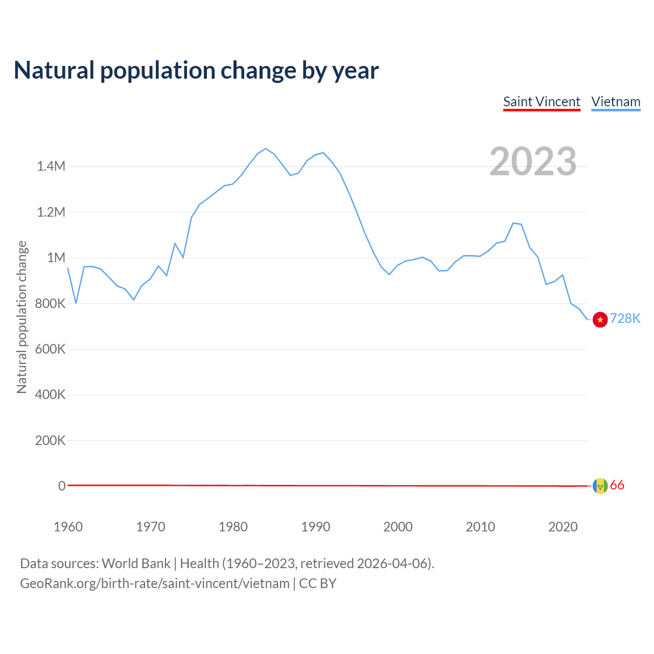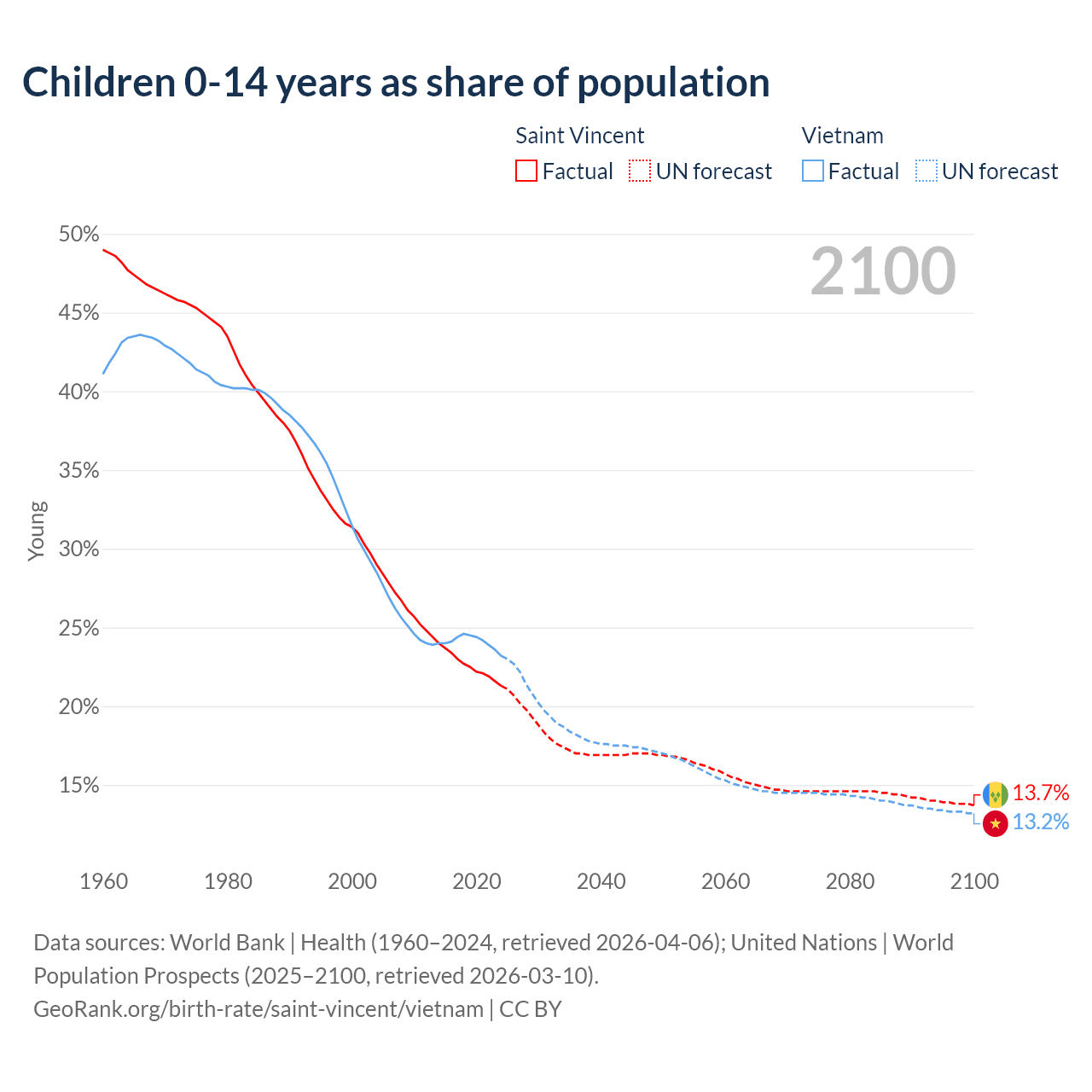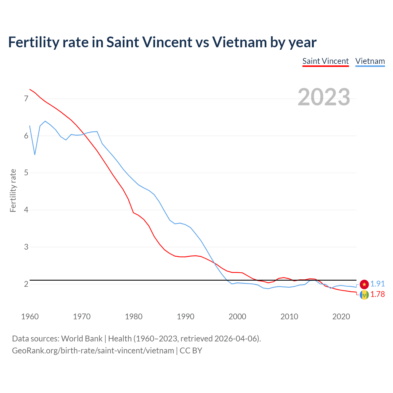 According to the latest available data on birth rates, the fertility rate in Saint Vincent was 1.78 children per woman in 2023, compared to 1.91 in Vietnam in 2023. The replacement level is considered to be 2.1 children per woman.