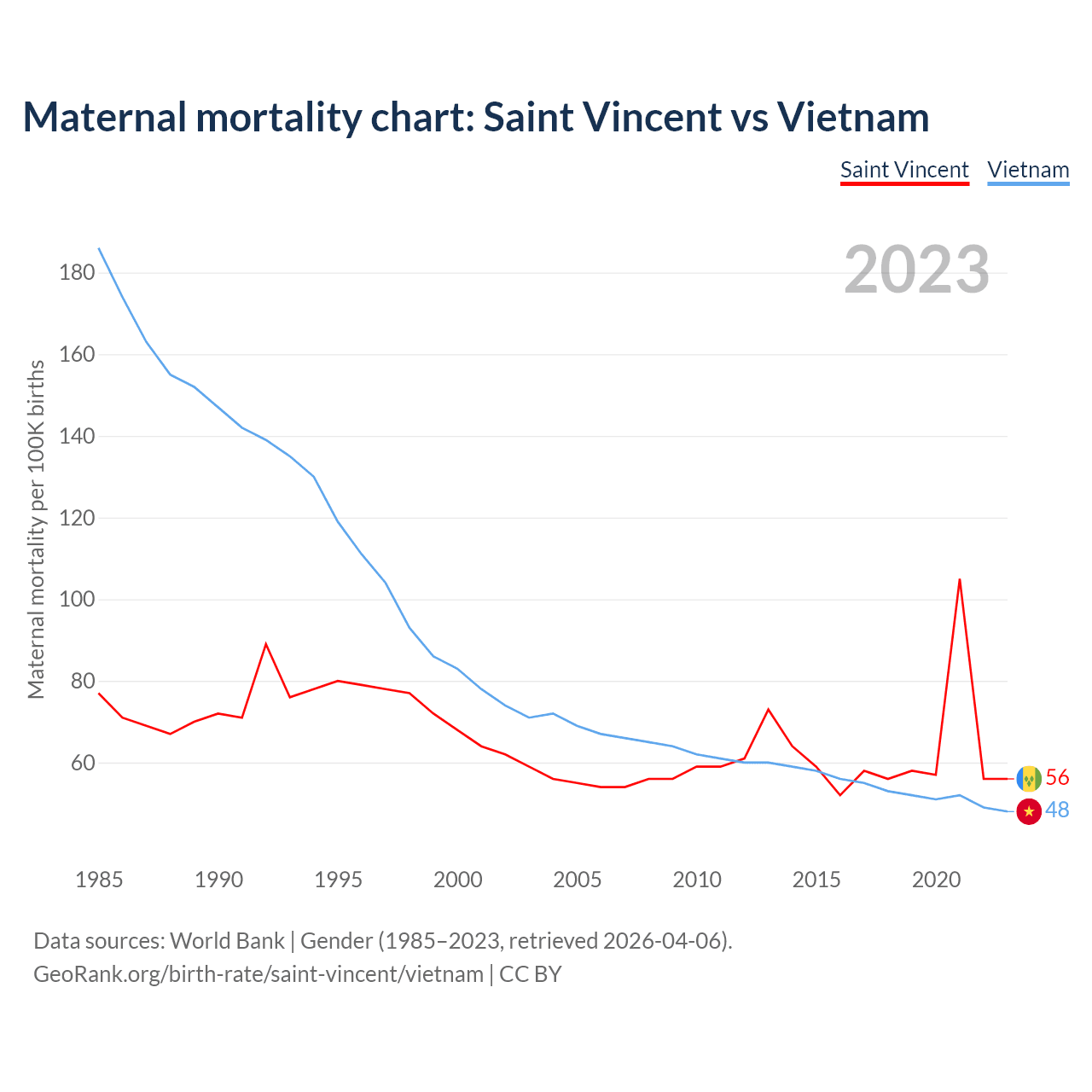 The maternal mortality rate, which is the probability of dying during childbirth or within 42 days of pregnancy termination, is 56 deaths per 100,000 live births in Saint Vincent, compared to 48 deaths in Vietnam.