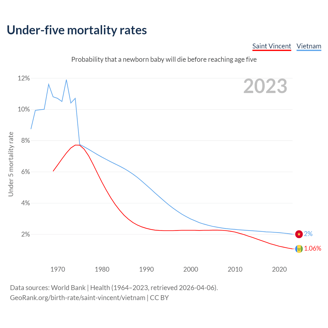 The chance that a newborn baby will die before reaching age five is 1.06% in Saint Vincent and 2% in Vietnam. Above is a chart with historical data on under-five mortality rates.
