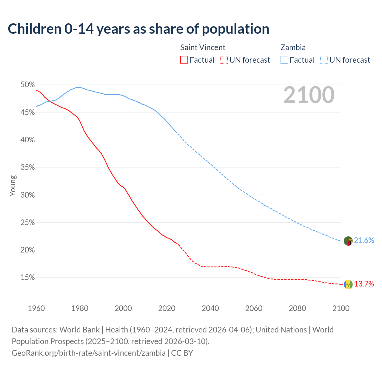 According to the latest available data on birth rates, the fertility rate in Saint Vincent was 1.78 children per woman in 2023, compared to 4.1 in Zambia in 2023. The replacement level is considered to be 2.1 children per woman.