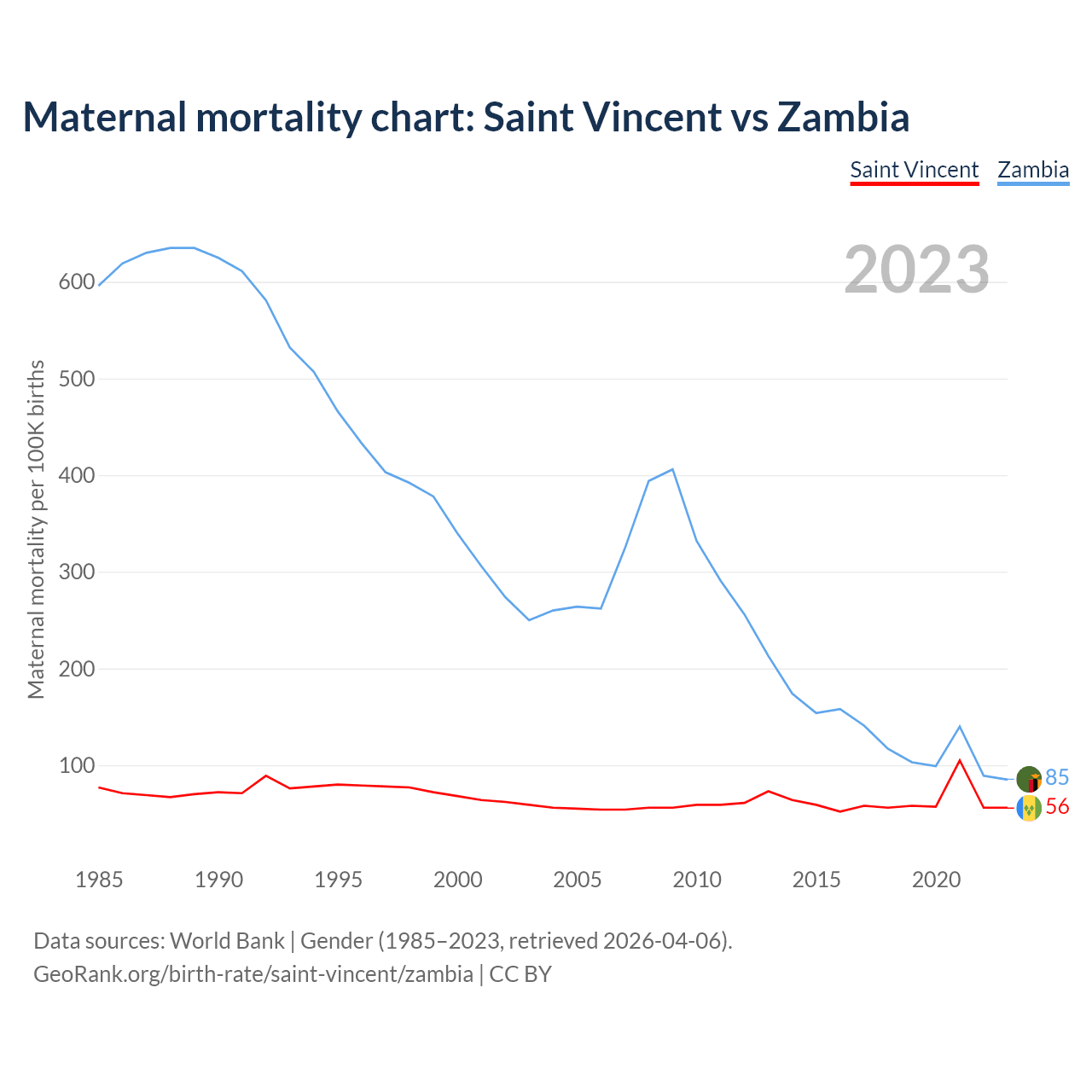 The maternal mortality rate, which is the probability of dying during childbirth or within 42 days of pregnancy termination, is 56 deaths per 100,000 live births in Saint Vincent, compared to 85 deaths in Zambia.
