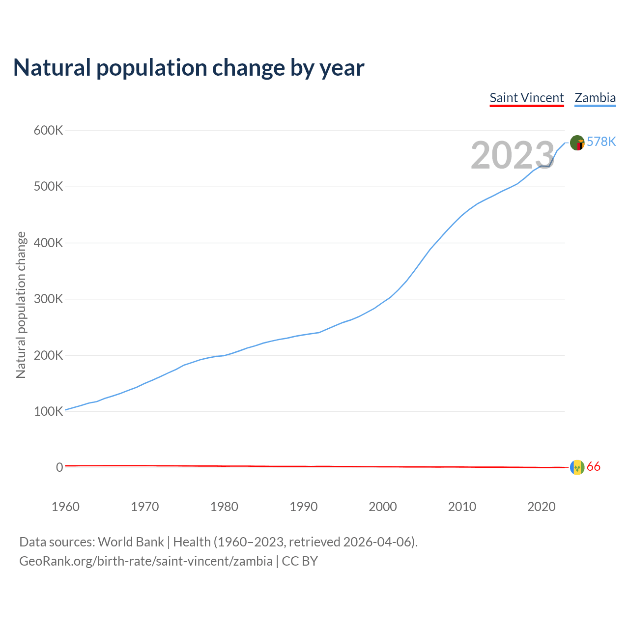 Saint Vincent has an annual birth rate of 12.2 births per 1,000 people, compared to 33.1 for Zambia. The average number of children a woman is expected to have during her lifetime — the fertility rate, is 1.78 in Saint Vincent and 4.1 in Zambia — 131% difference.