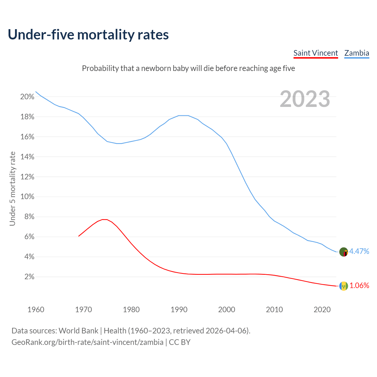 The chance that a newborn baby will die before reaching age five is 1.06% in Saint Vincent and 4.47% in Zambia. Above is a chart with historical data on under-five mortality rates.