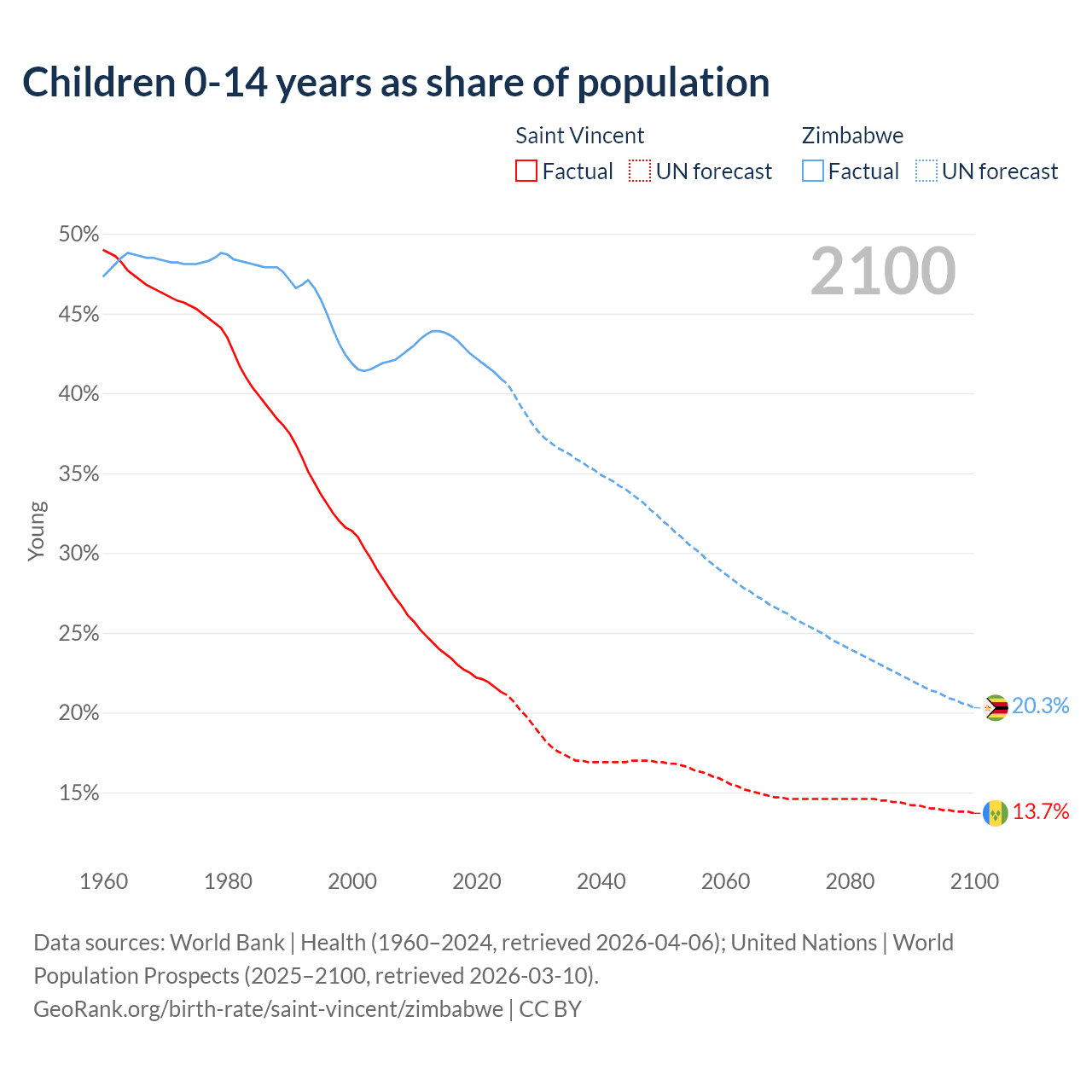 According to the latest available data on birth rates, the fertility rate in Saint Vincent was 1.78 children per woman in 2023, compared to 3.72 in Zimbabwe in 2023. The replacement level is considered to be 2.1 children per woman.