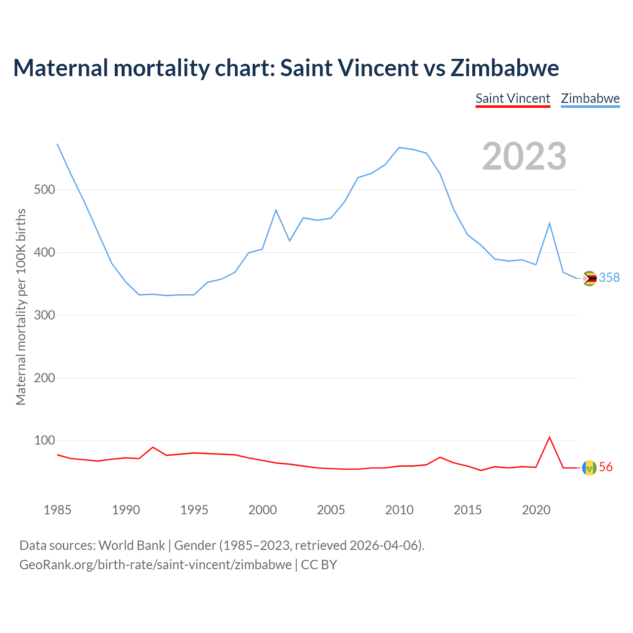The maternal mortality rate, which is the probability of dying during childbirth or within 42 days of pregnancy termination, is 56 deaths per 100,000 live births in Saint Vincent, compared to 358 deaths in Zimbabwe.