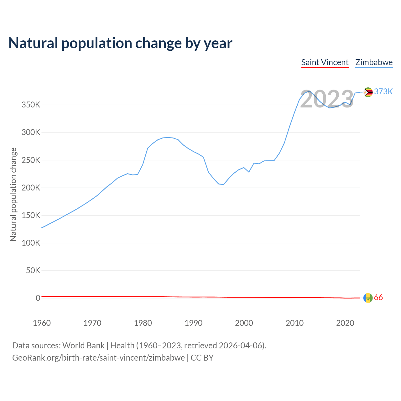 Check Saint Vincent vs Zimbabwe population clock for a dynamic visualization of the changing population.