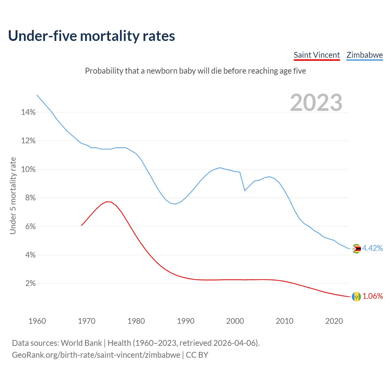 The chance that a newborn baby will die before reaching age five is 1.06% in Saint Vincent and 4.42% in Zimbabwe. Above is a chart with historical data on under-five mortality rates.