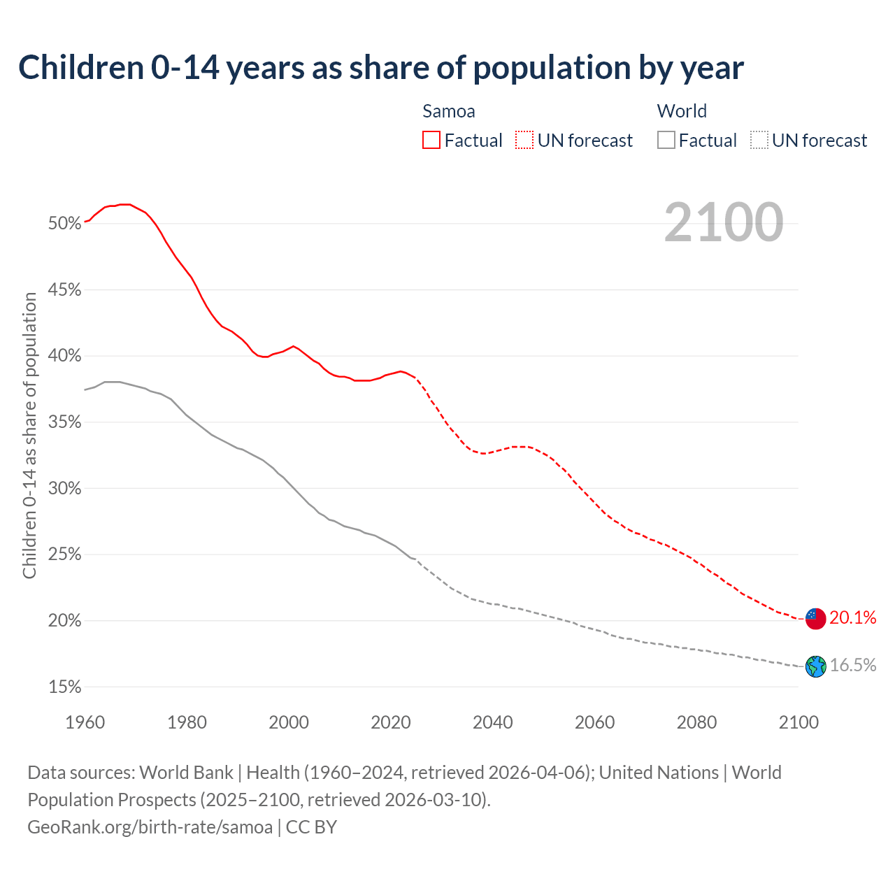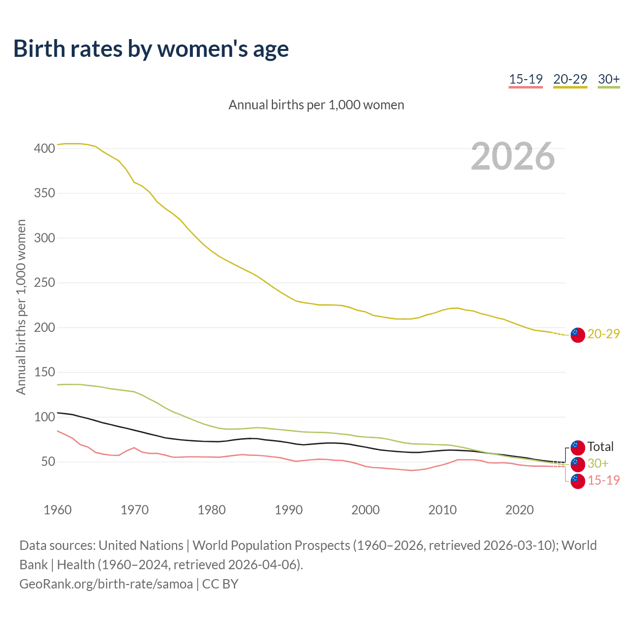 Samoa has a birth rate of 25.4 (annual births per 1,000 people) and a fertility rate of 3.83 (the average number of children a woman is expected to have over her lifetime based on current age-specific birth rates).