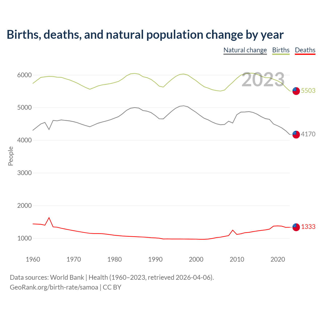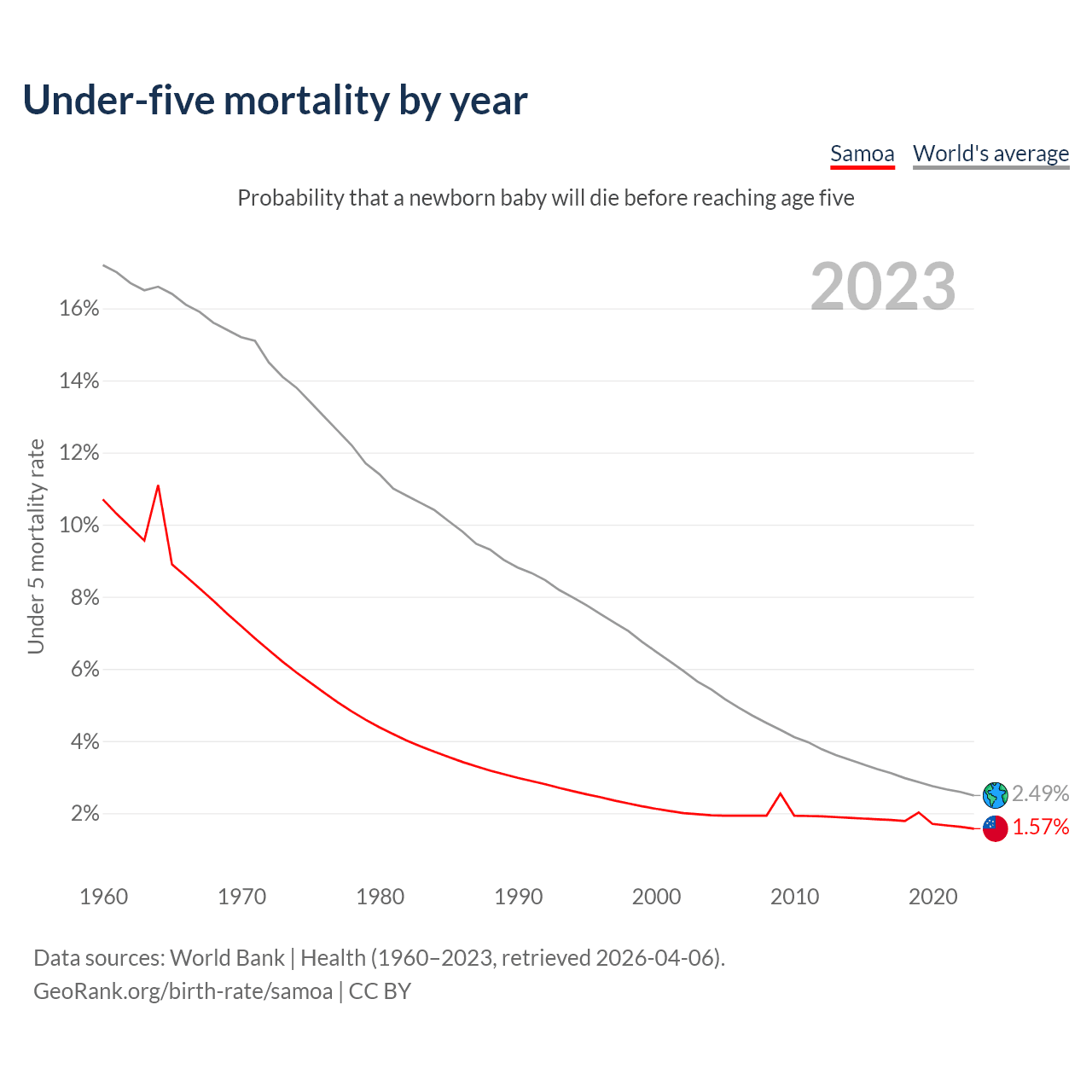 The under-5 mortality rate in Samoa was 15.7 deaths per 1,000 live births in 2023 — a 1.57% chance that a newborn baby will die before reaching age five. This is down from 21.2 deaths per 1,000 live births in 2000.