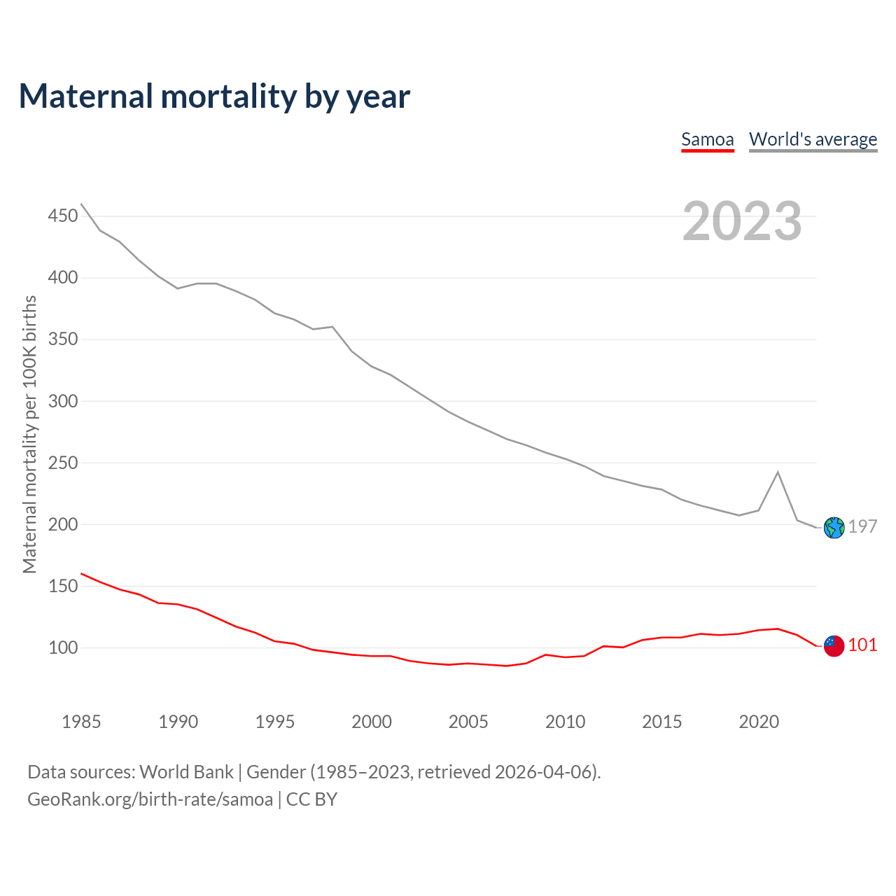 The maternal mortality rate in Samoa was 101 deaths per 100,000 live births in 2023 — a 0.1% chance of dying during childbirth or within 42 days of pregnancy termination. This is a 8.6% increase compared to the year 2000.