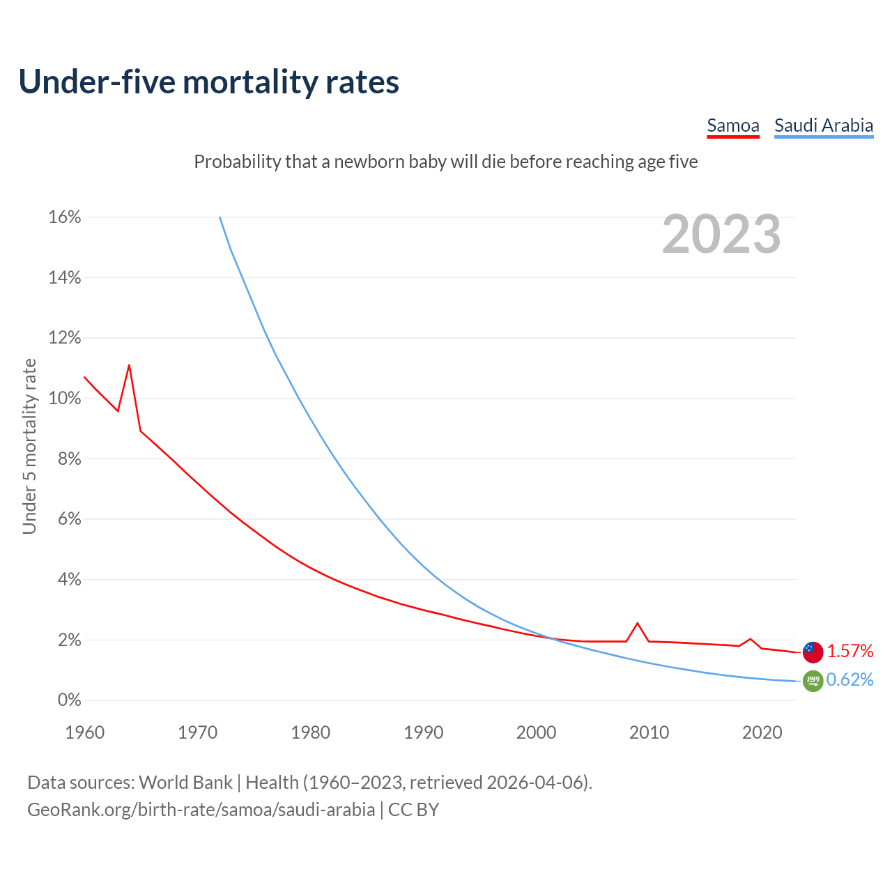 The chance that a newborn baby will die before reaching age five is 1.57% in Samoa and 0.62% in Saudi Arabia. Above is a chart with historical data on under-five mortality rates.