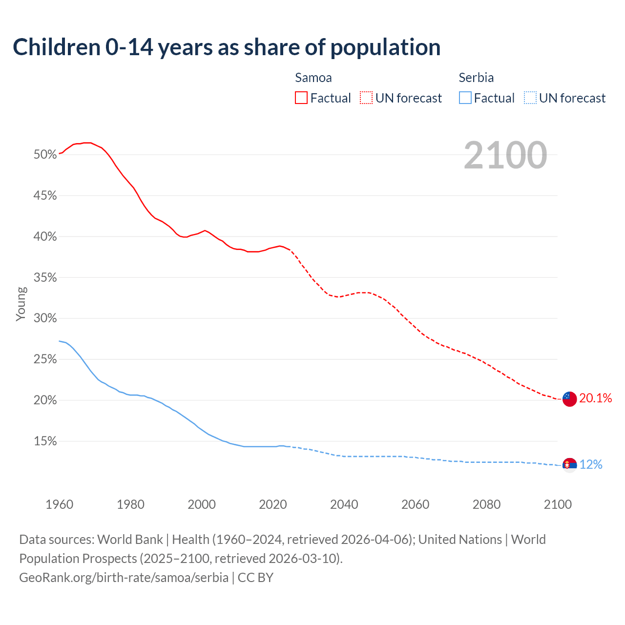 Samoa has an annual birth rate of 25.4 births per 1,000 people, compared to 9.2 for Serbia. The average number of children a woman is expected to have during her lifetime — the fertility rate, is 3.83 in Samoa and 1.61 in Serbia — 58% difference.