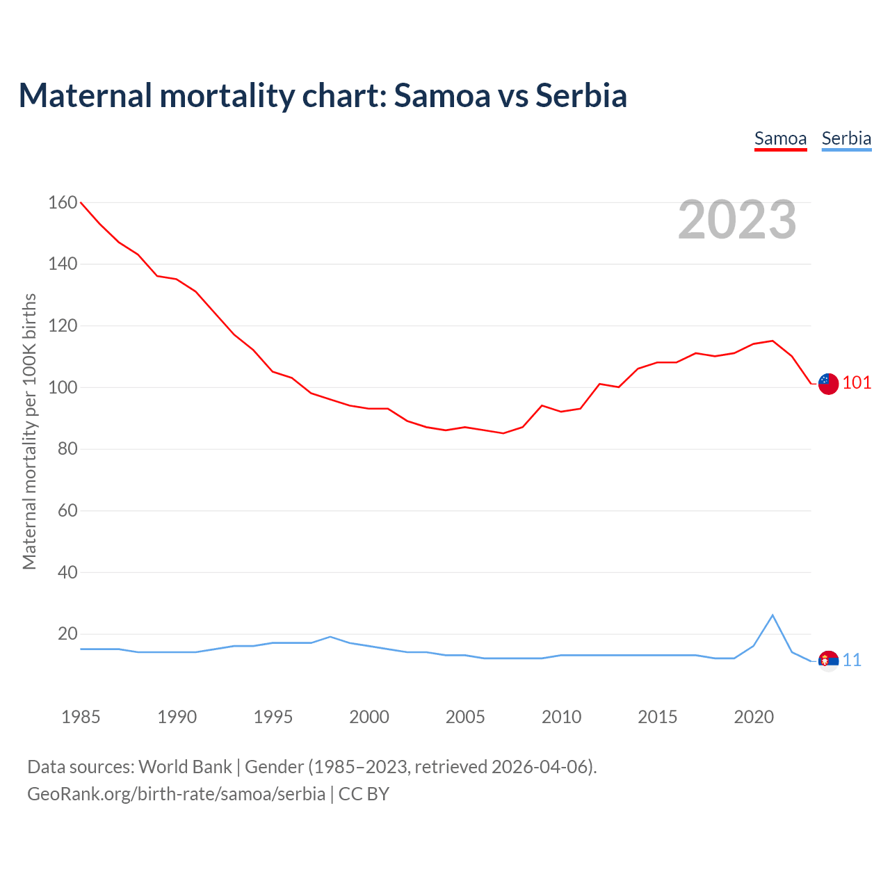 The maternal mortality rate, which is the probability of dying during childbirth or within 42 days of pregnancy termination, is 101 deaths per 100,000 live births in Samoa, compared to 11 deaths in Serbia.