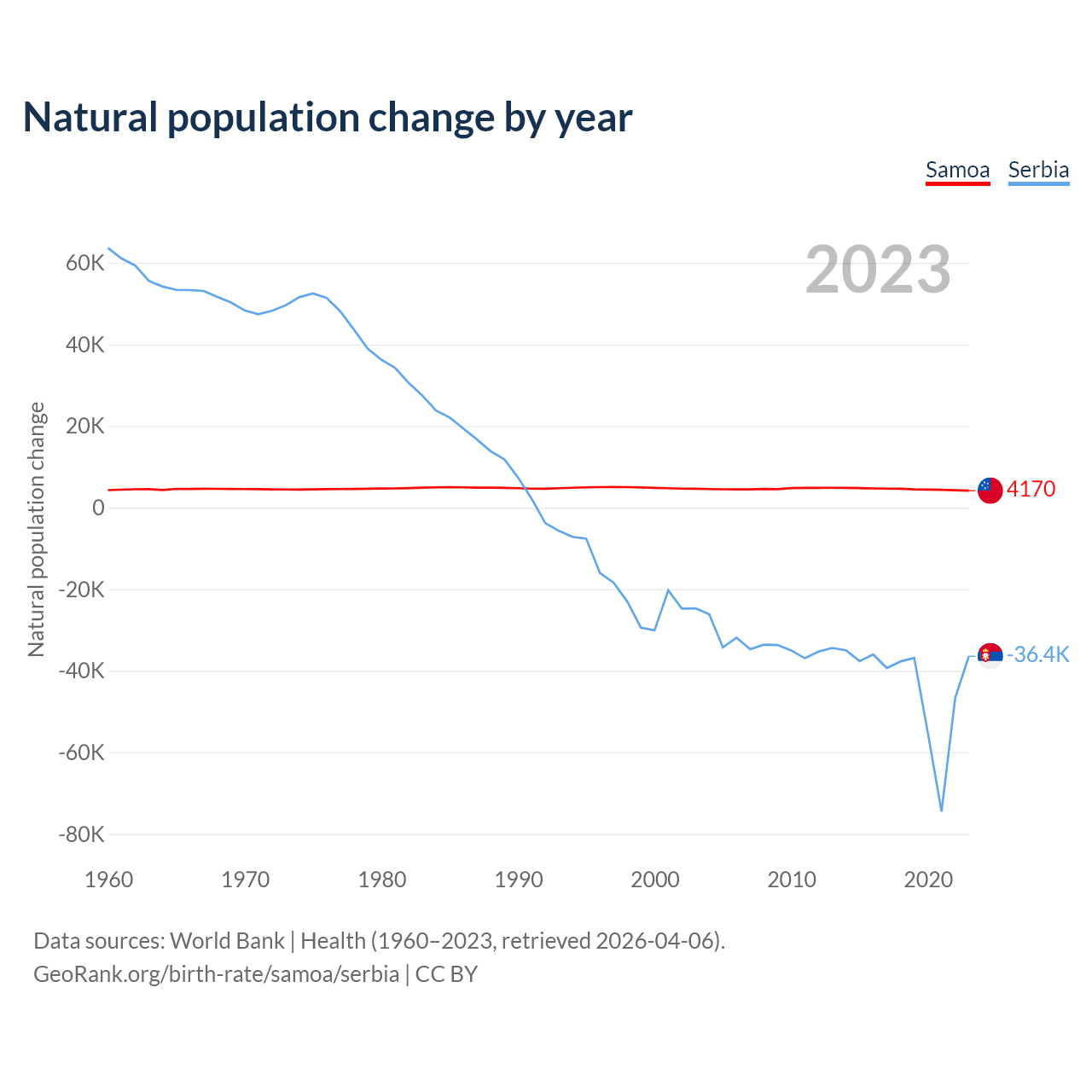 According to the latest available data on birth rates, the fertility rate in Samoa was 3.83 children per woman in 2023, compared to 1.61 in Serbia in 2023. The replacement level is considered to be 2.1 children per woman.