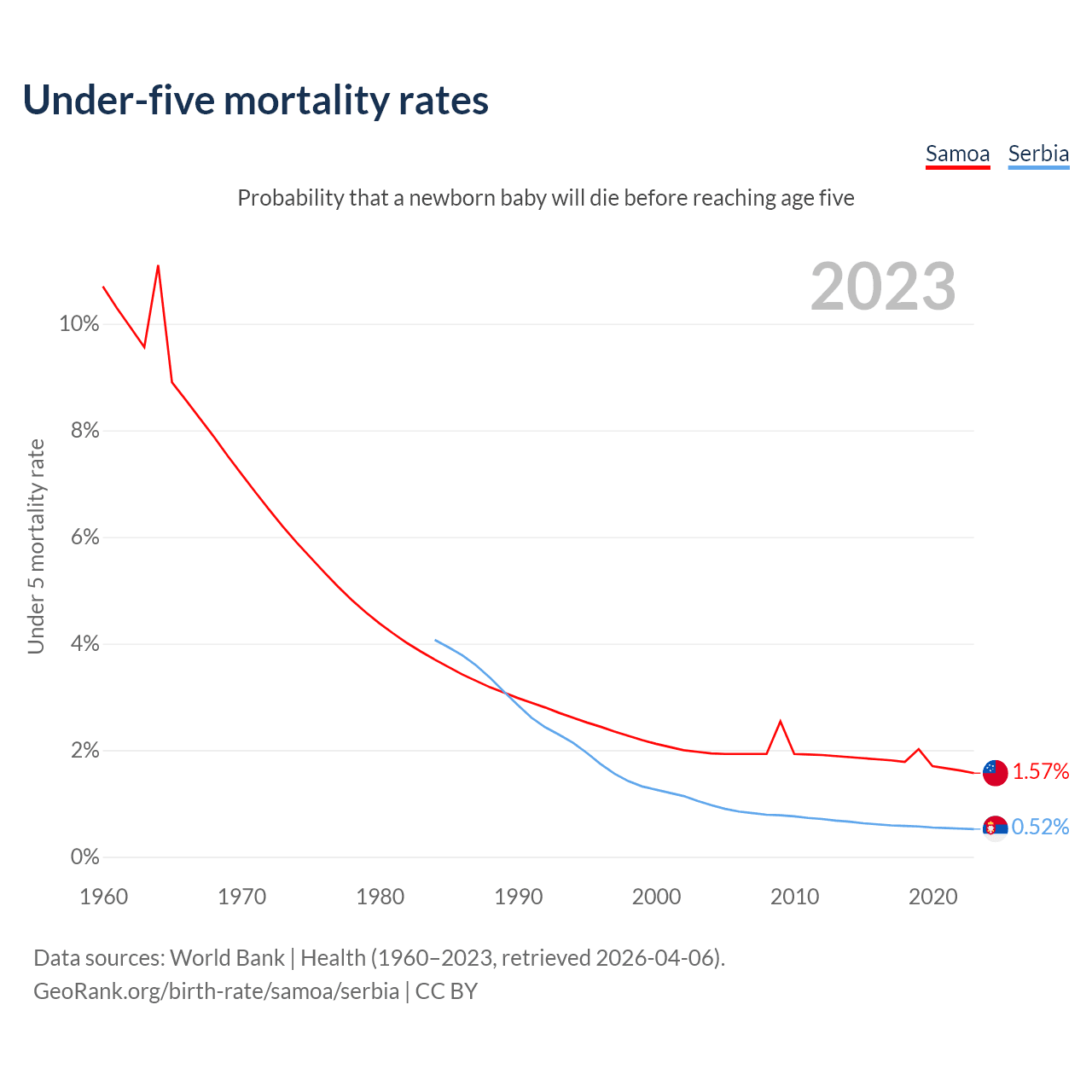 The chance that a newborn baby will die before reaching age five is 1.57% in Samoa and 0.52% in Serbia. Above is a chart with historical data on under-five mortality rates.