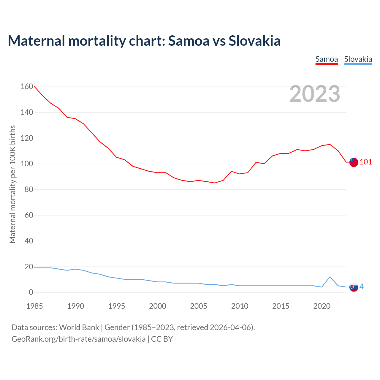 The maternal mortality rate, which is the probability of dying during childbirth or within 42 days of pregnancy termination, is 101 deaths per 100,000 live births in Samoa, compared to 4 deaths in Slovakia.
