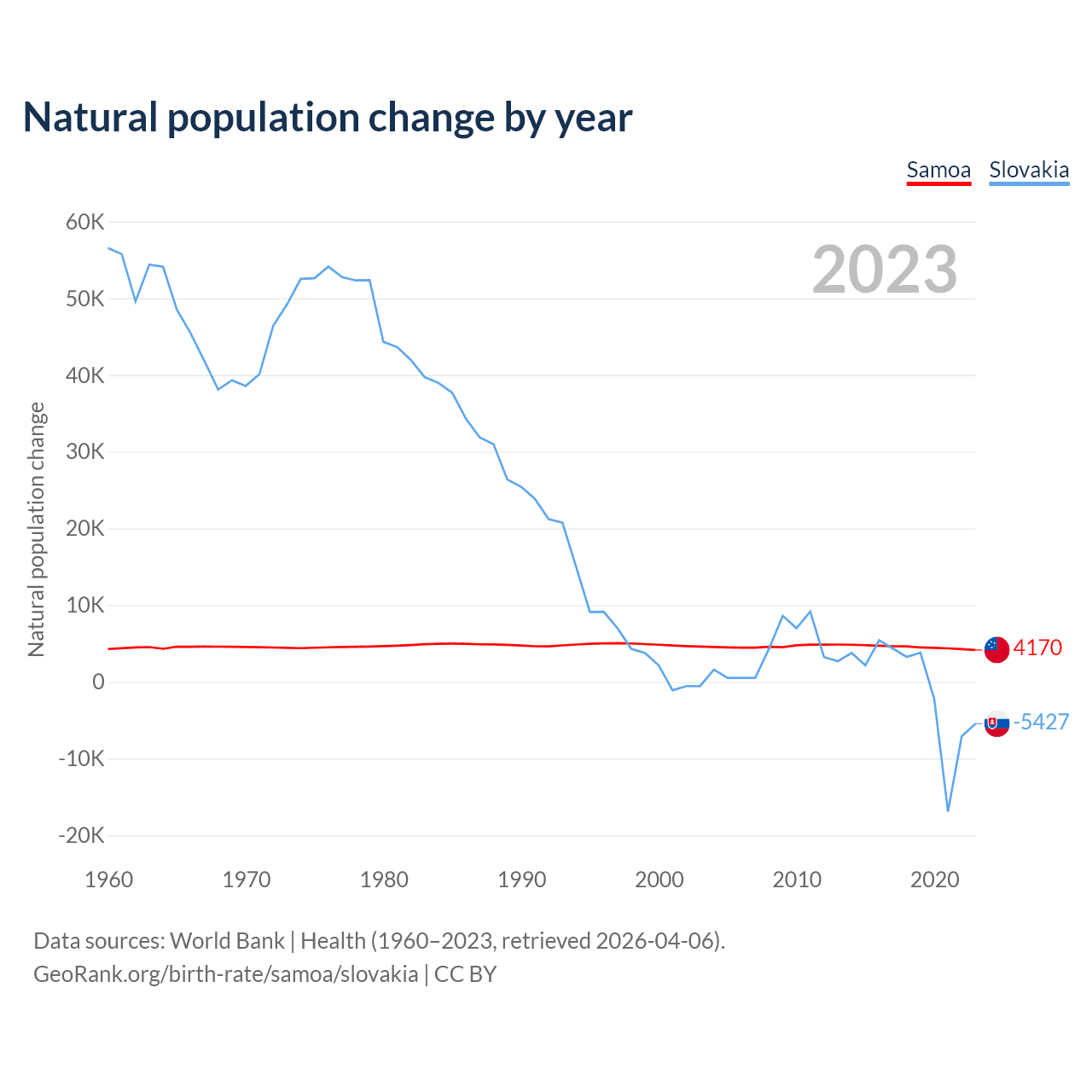 According to the latest available data on birth rates, the fertility rate in Samoa was 3.83 children per woman in 2023, compared to 1.49 in Slovakia in 2023. The replacement level is considered to be 2.1 children per woman.