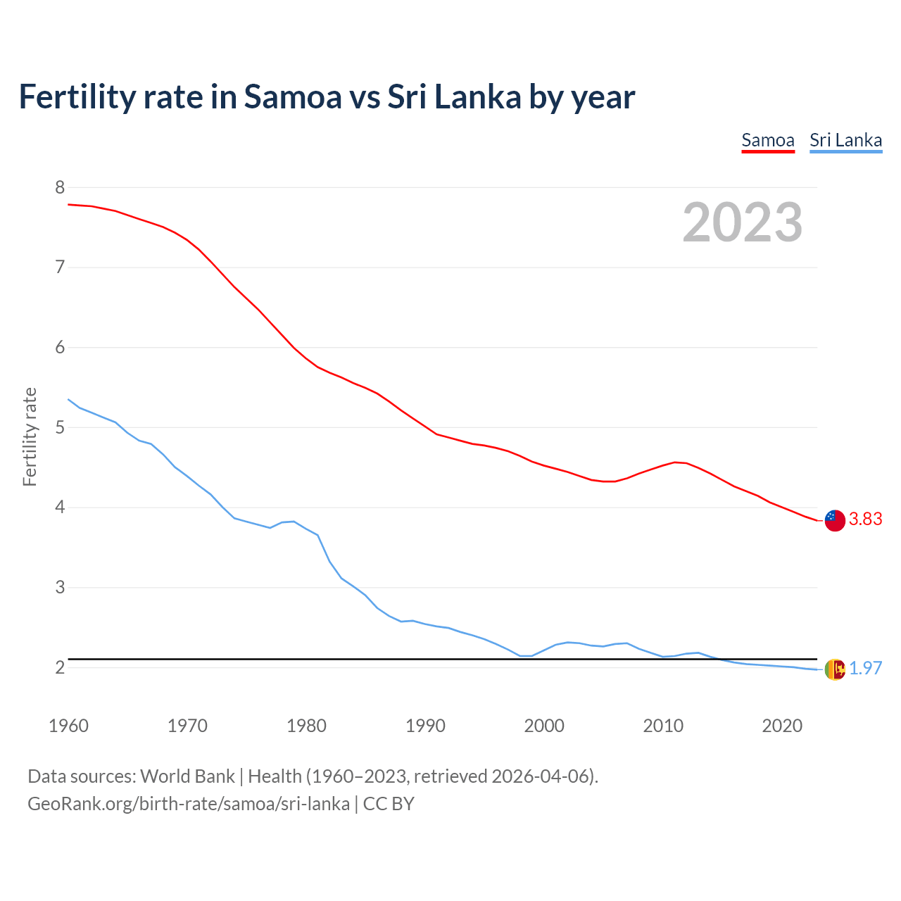 1960 vs 2023, the fertility rate has decreased by 50.8% in Samoa and by 63.1% in Sri Lanka — in 1960, it was 7.78 and 5.35, respectively.