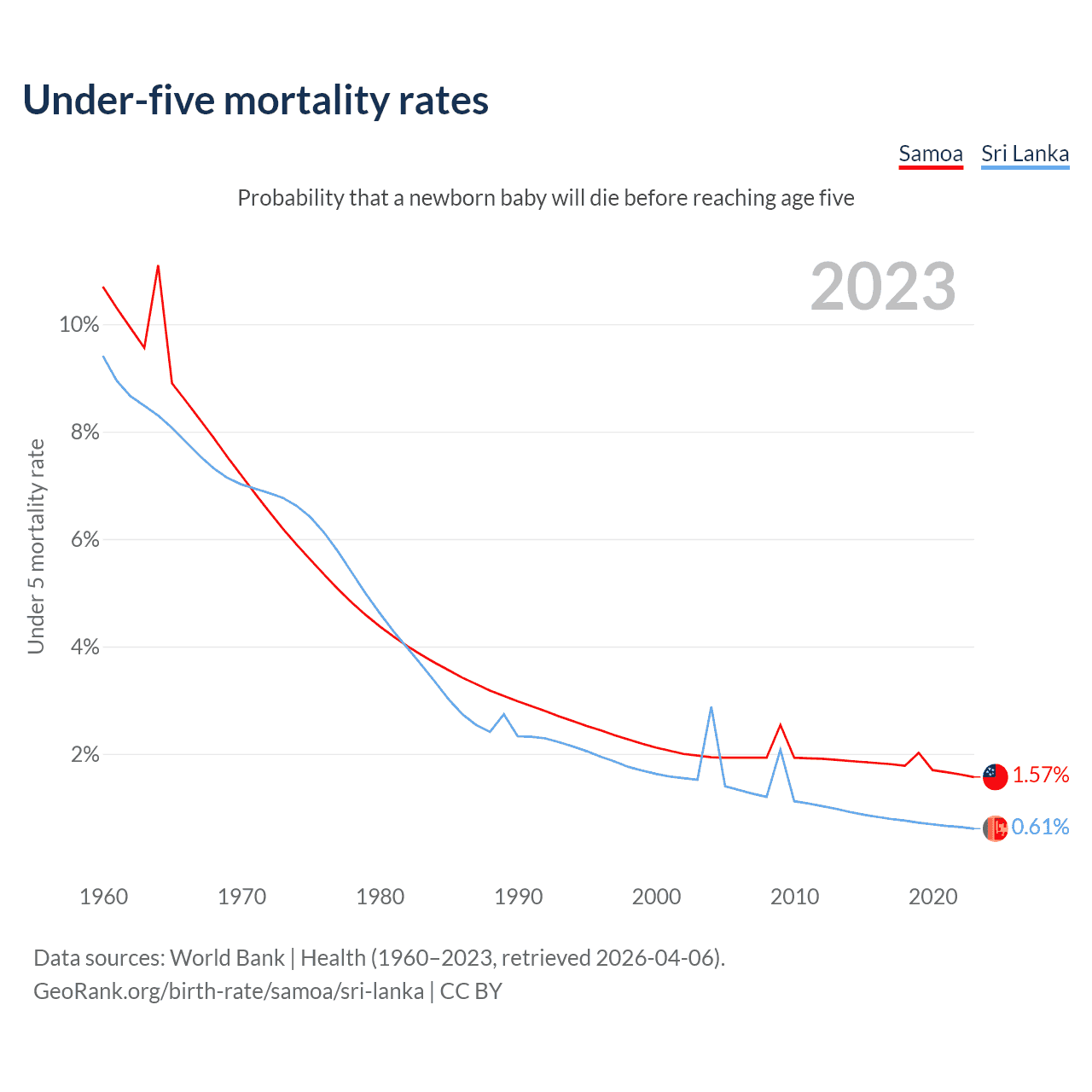 The chance that a newborn baby will die before reaching age five is 1.57% in Samoa and 0.61% in Sri Lanka. Above is a chart with historical data on under-five mortality rates.