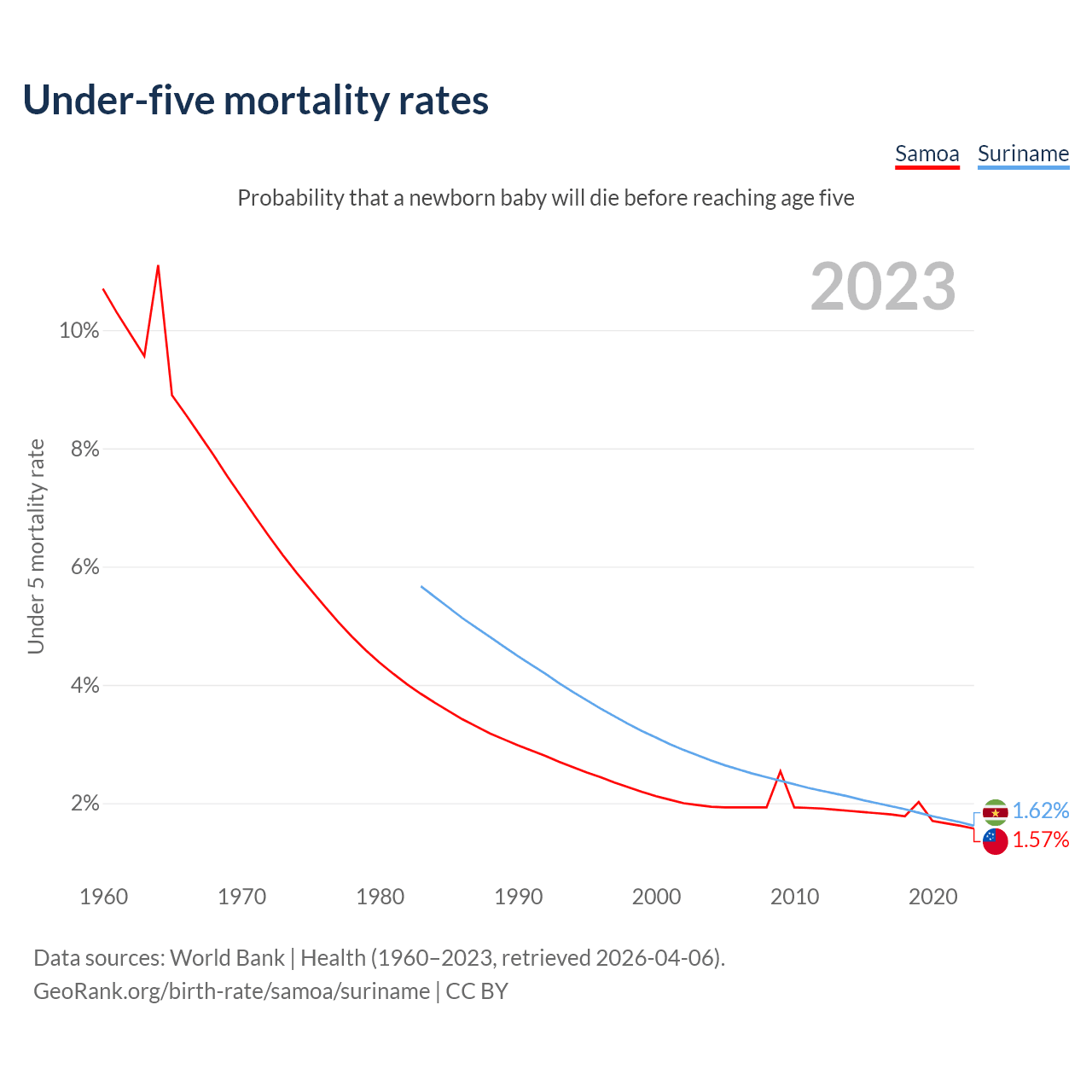 The chance that a newborn baby will die before reaching age five is 1.57% in Samoa and 1.62% in Suriname. Above is a chart with historical data on under-five mortality rates.