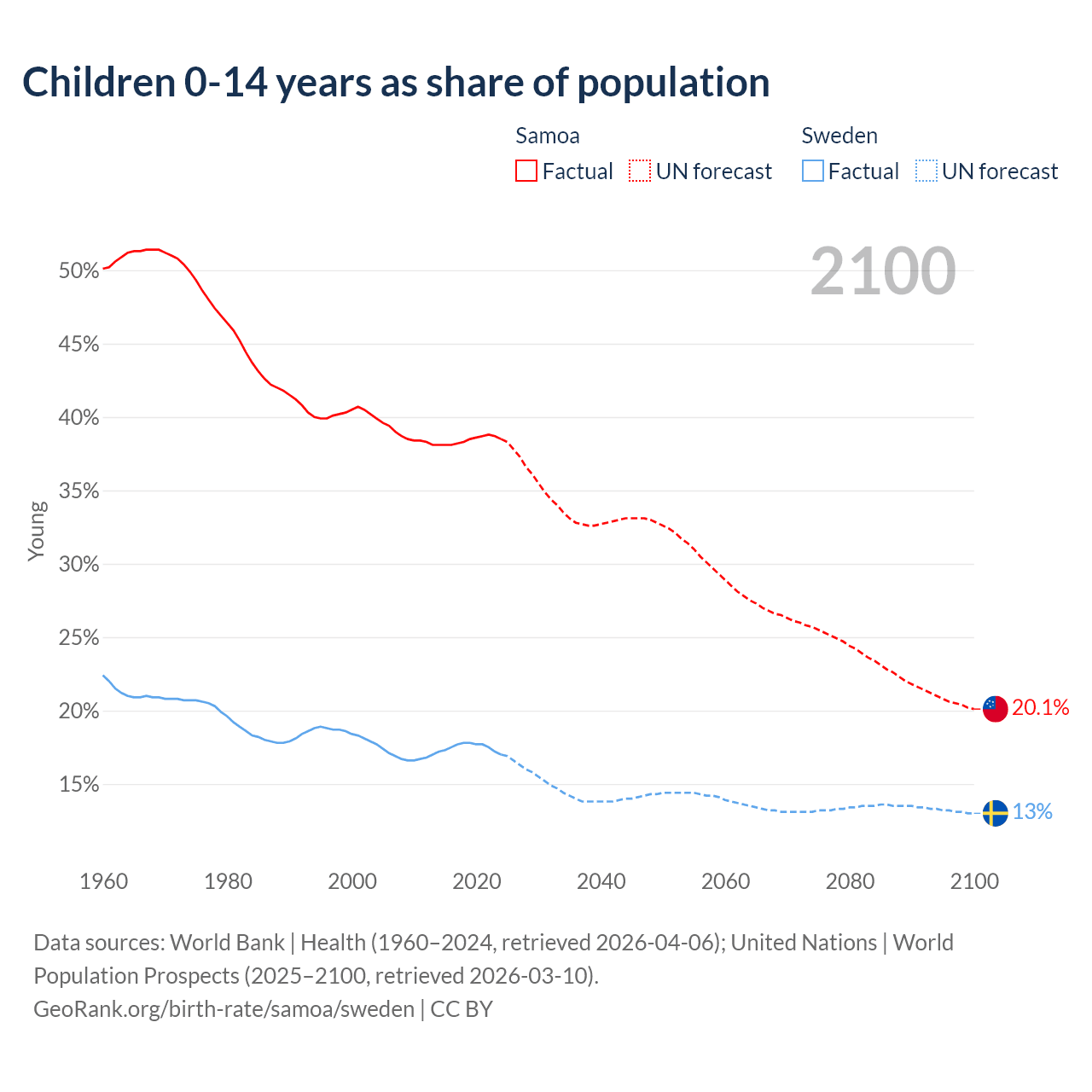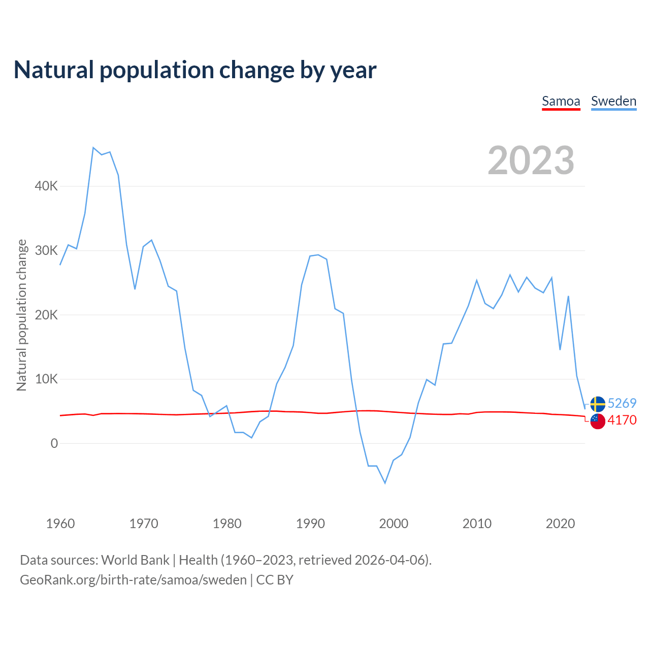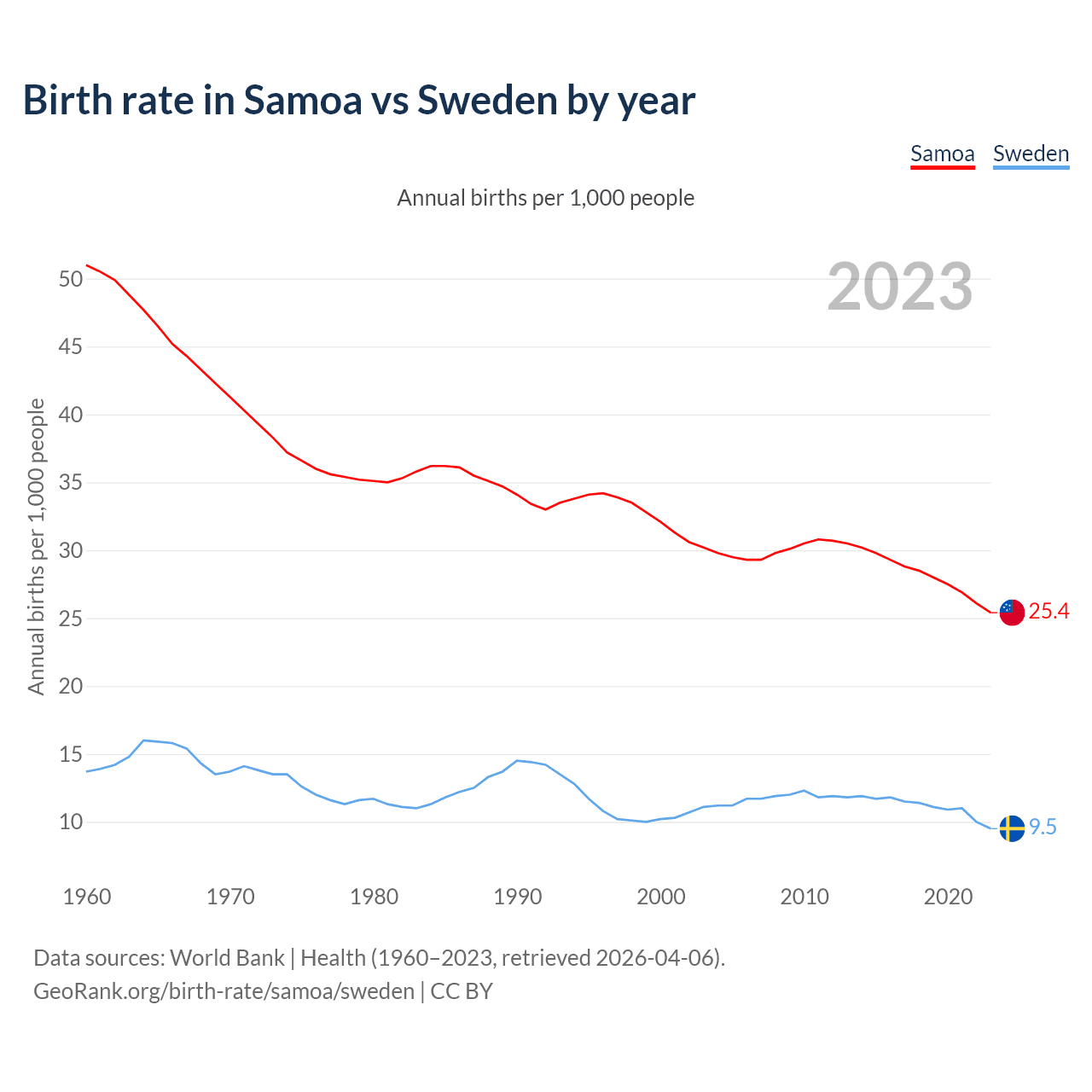 Samoa has an annual birth rate of 25.4 births per 1,000 people, compared to 9.5 for Sweden. The average number of children a woman is expected to have during her lifetime — the fertility rate, is 3.83 in Samoa and 1.45 in Sweden — 62.1% difference.