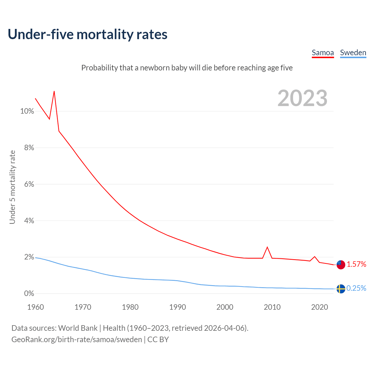The chance that a newborn baby will die before reaching age five is 1.57% in Samoa and 0.25% in Sweden. Above is a chart with historical data on under-five mortality rates.