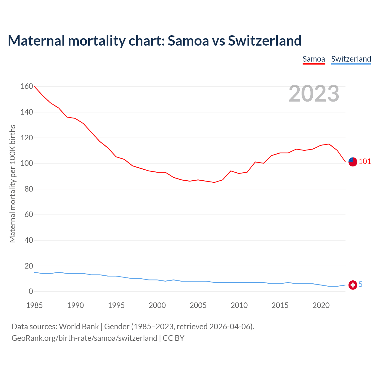 The maternal mortality rate, which is the probability of dying during childbirth or within 42 days of pregnancy termination, is 101 deaths per 100,000 live births in Samoa, compared to 5 deaths in Switzerland.