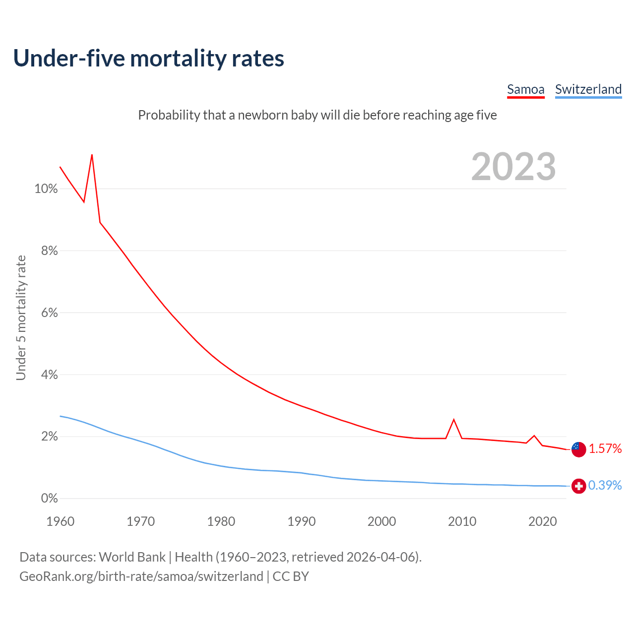 The chance that a newborn baby will die before reaching age five is 1.57% in Samoa and 0.39% in Switzerland. Above is a chart with historical data on under-five mortality rates.