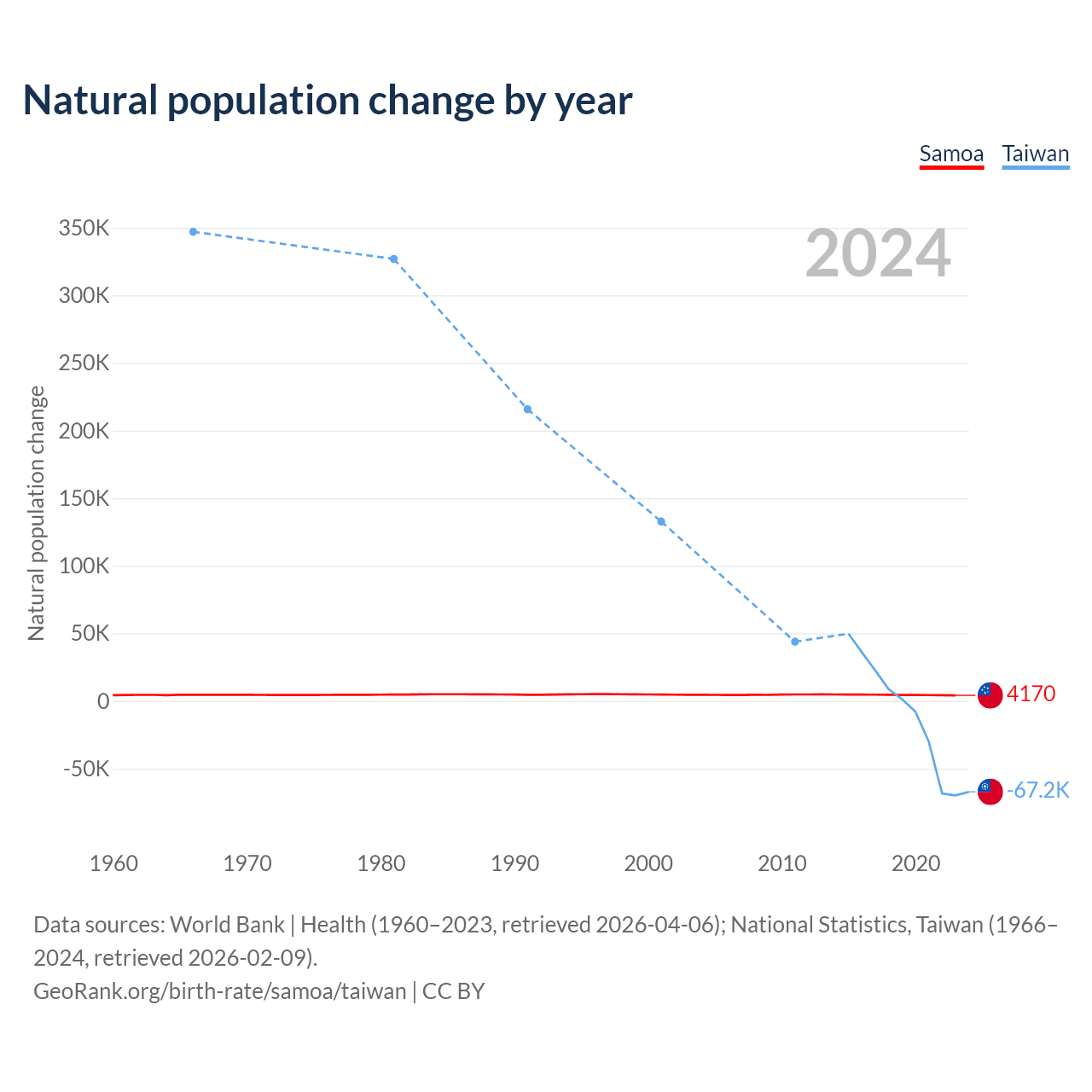 Data sources: World Bank | Health (1960–2023, retrieved 2026-04-06); National Statistics, Taiwan (1951–2024, retrieved 2026-02-09).