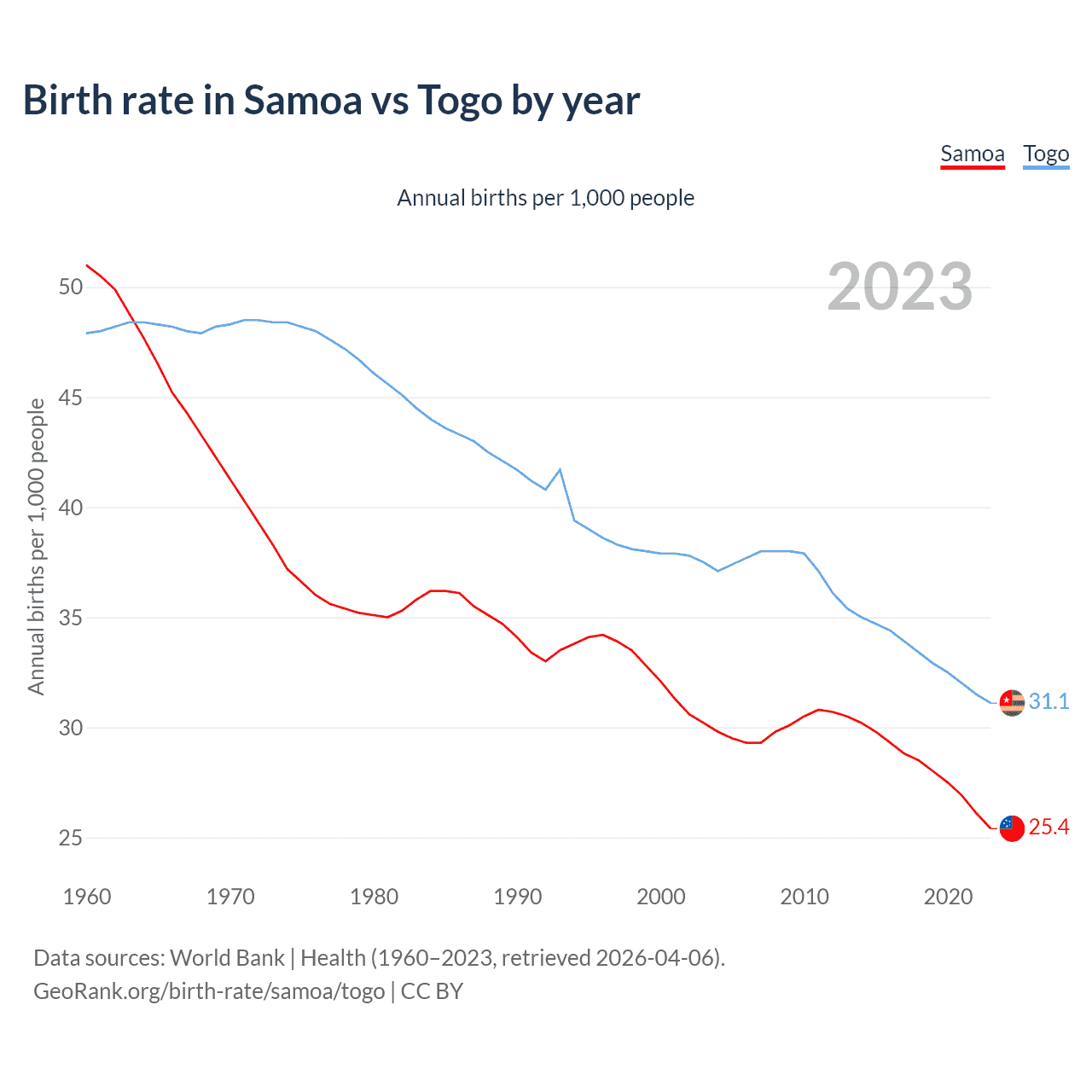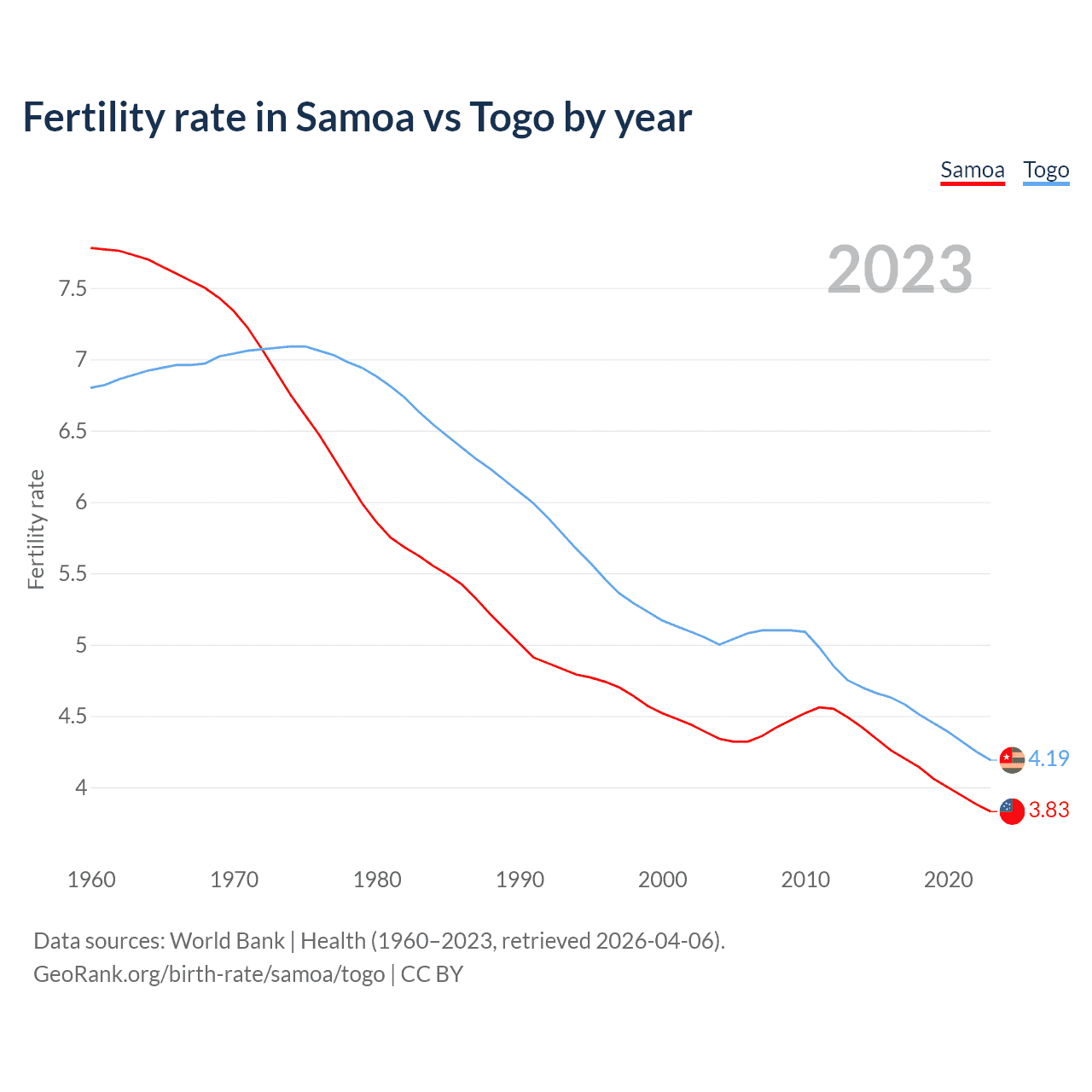 According to the latest available data on birth rates, the fertility rate in Samoa was 3.83 children per woman in 2023, compared to 4.19 in Togo in 2023. The replacement level is considered to be 2.1 children per woman.