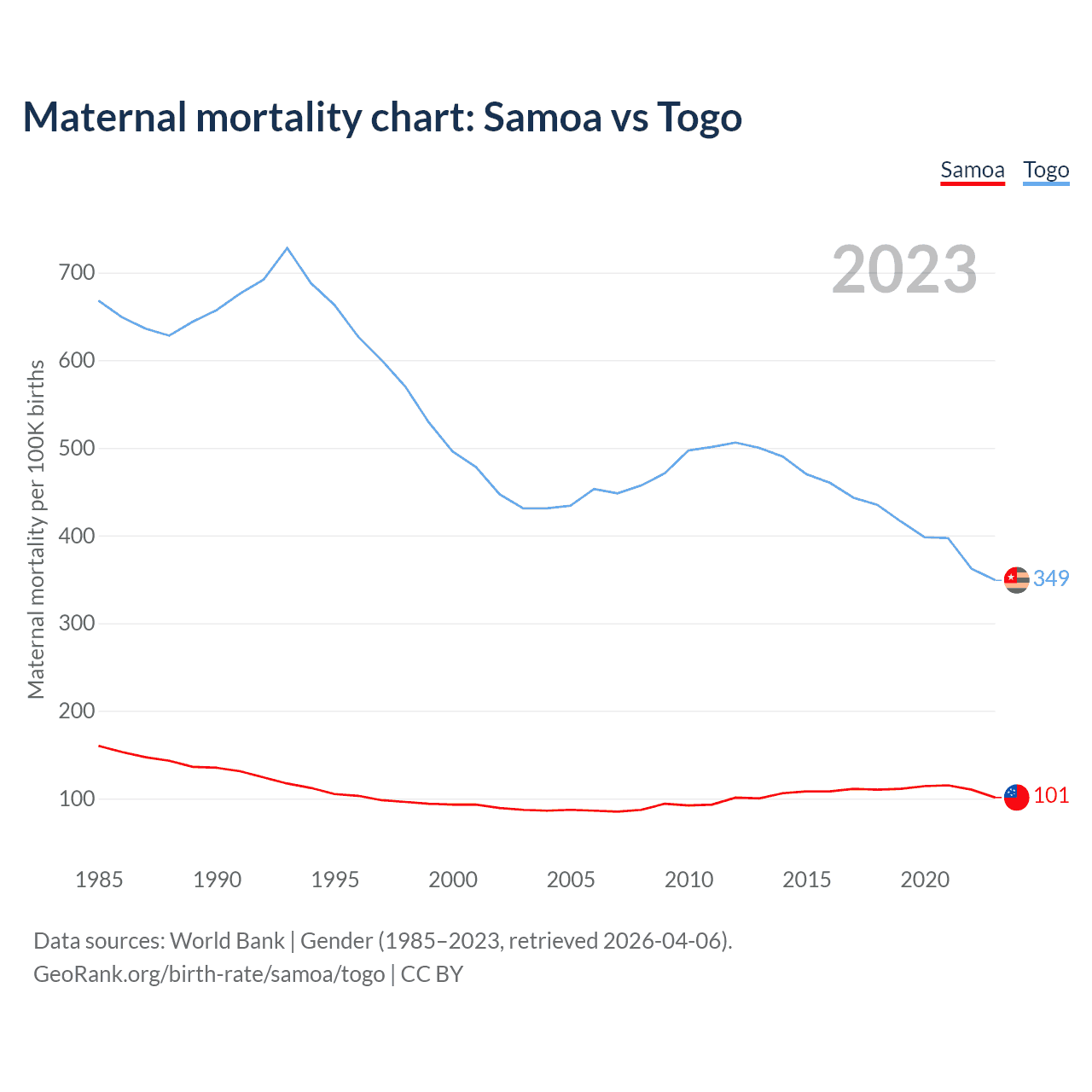 The maternal mortality rate, which is the probability of dying during childbirth or within 42 days of pregnancy termination, is 101 deaths per 100,000 live births in Samoa, compared to 349 deaths in Togo.