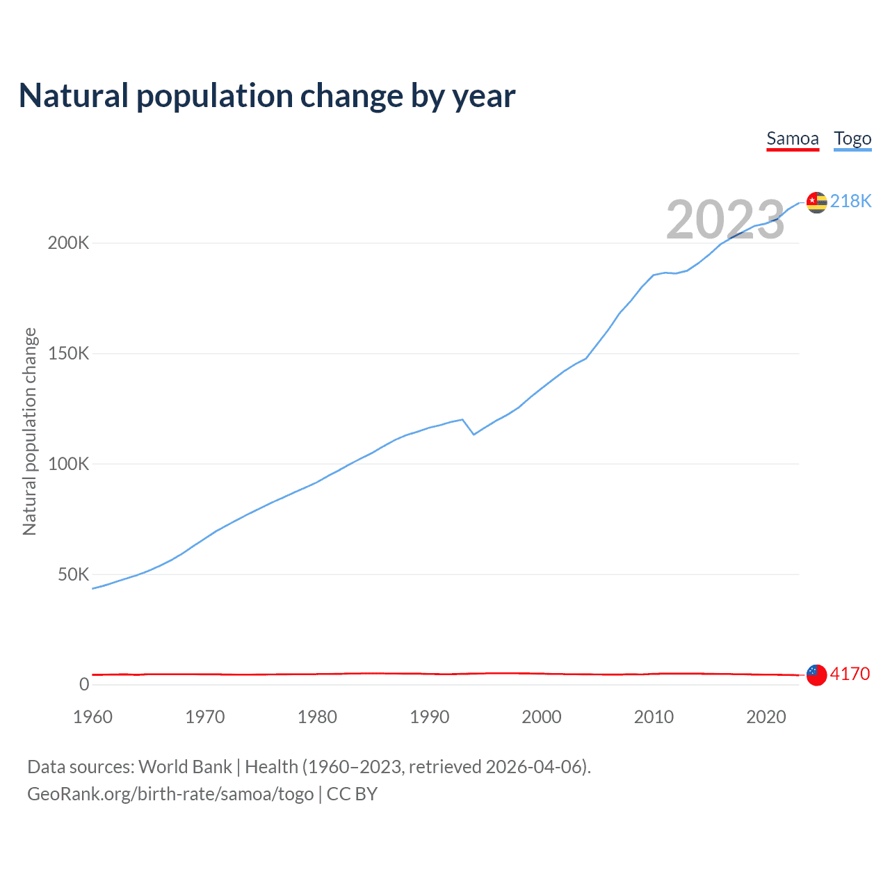 Samoa has an annual birth rate of 25.4 births per 1,000 people, compared to 31.1 for Togo. The average number of children a woman is expected to have during her lifetime — the fertility rate, is 3.83 in Samoa and 4.19 in Togo — 9.48% difference.