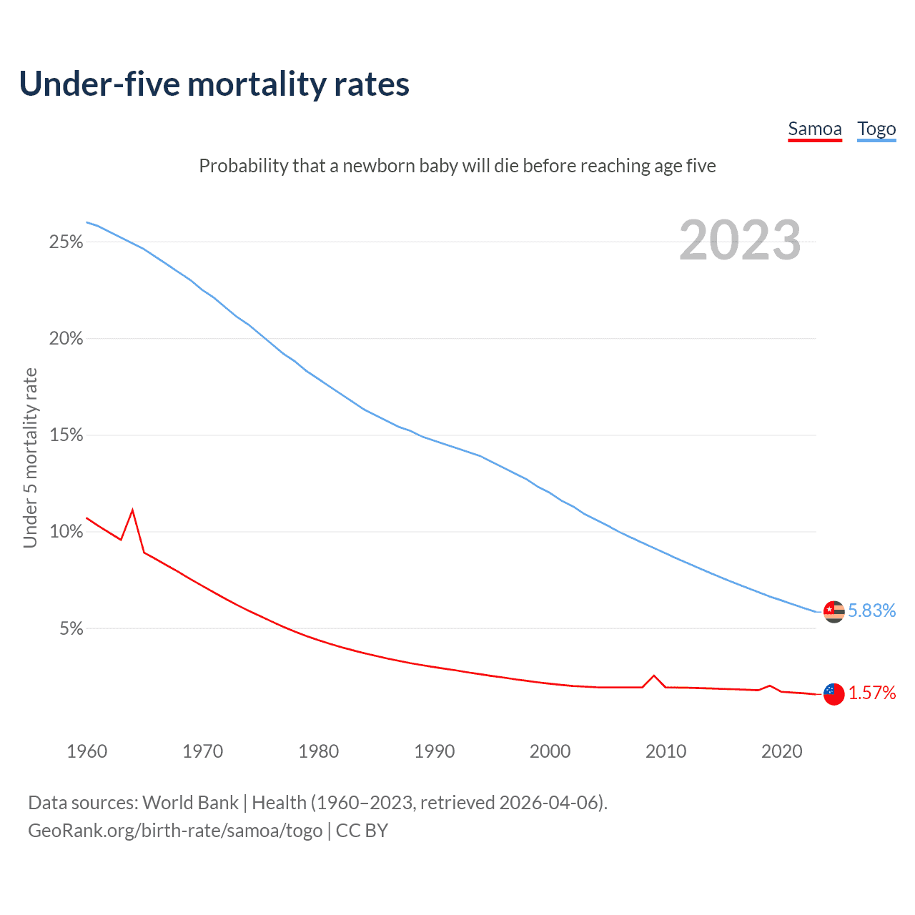The chance that a newborn baby will die before reaching age five is 1.57% in Samoa and 5.83% in Togo. Above is a chart with historical data on under-five mortality rates.