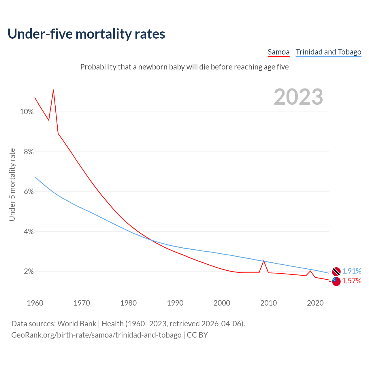 The chance that a newborn baby will die before reaching age five is 1.57% in Samoa and 1.91% in Trinidad and Tobago. Above is a chart with historical data on under-five mortality rates.