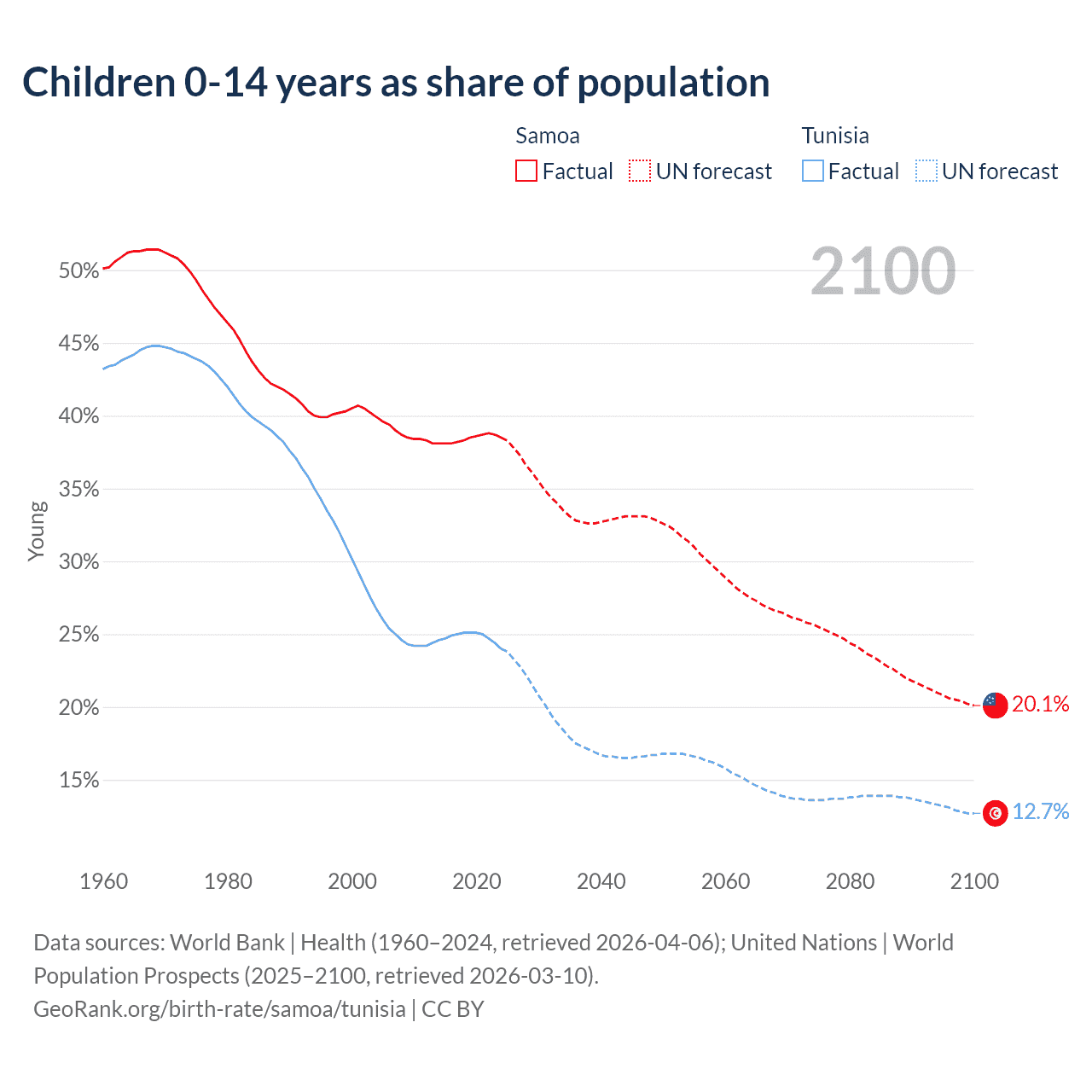 Samoa has an annual birth rate of 25.4 births per 1,000 people, compared to 13.7 for Tunisia. The average number of children a woman is expected to have during her lifetime — the fertility rate, is 3.83 in Samoa and 1.83 in Tunisia — 52.2% difference.