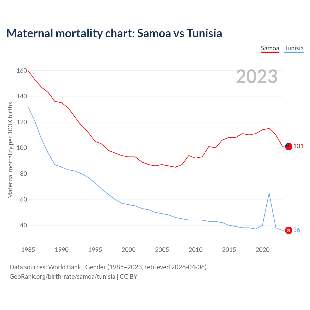 The maternal mortality rate, which is the probability of dying during childbirth or within 42 days of pregnancy termination, is 101 deaths per 100,000 live births in Samoa, compared to 36 deaths in Tunisia.