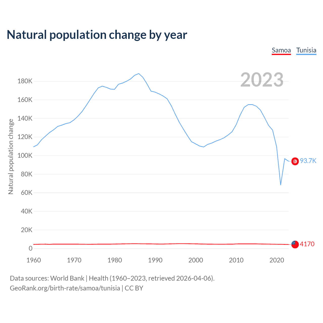 According to the latest available data on birth rates, the fertility rate in Samoa was 3.83 children per woman in 2023, compared to 1.83 in Tunisia in 2023. The replacement level is considered to be 2.1 children per woman.