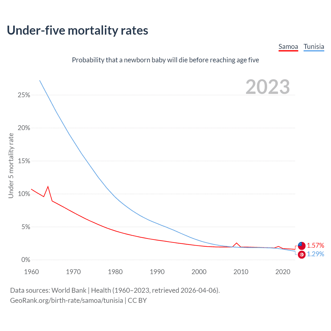 The chance that a newborn baby will die before reaching age five is 1.57% in Samoa and 1.29% in Tunisia. Above is a chart with historical data on under-five mortality rates.