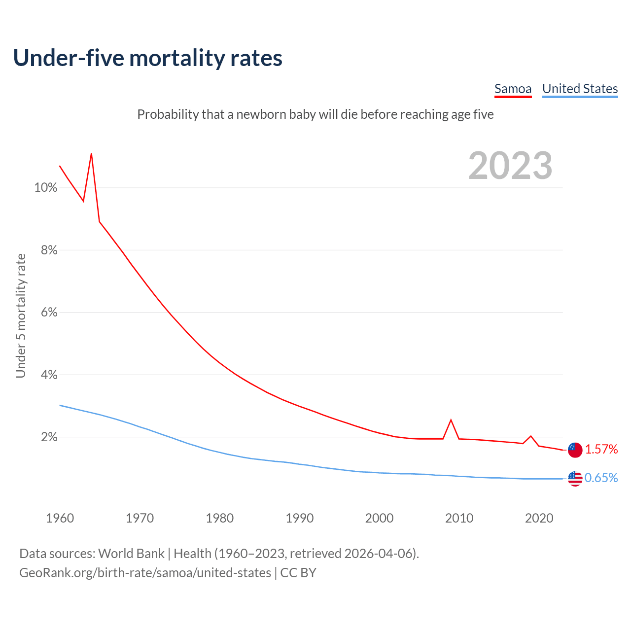 The chance that a newborn baby will die before reaching age five is 1.57% in Samoa and 0.65% in the United States. Above is a chart with historical data on under-five mortality rates.