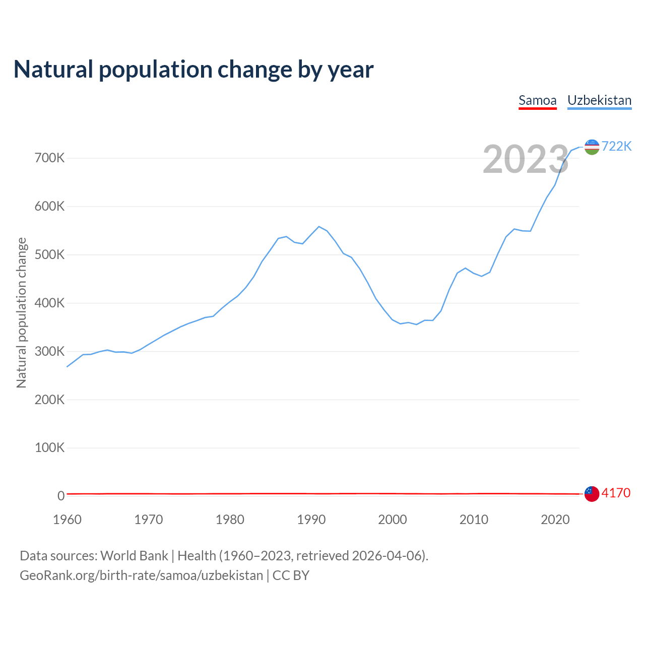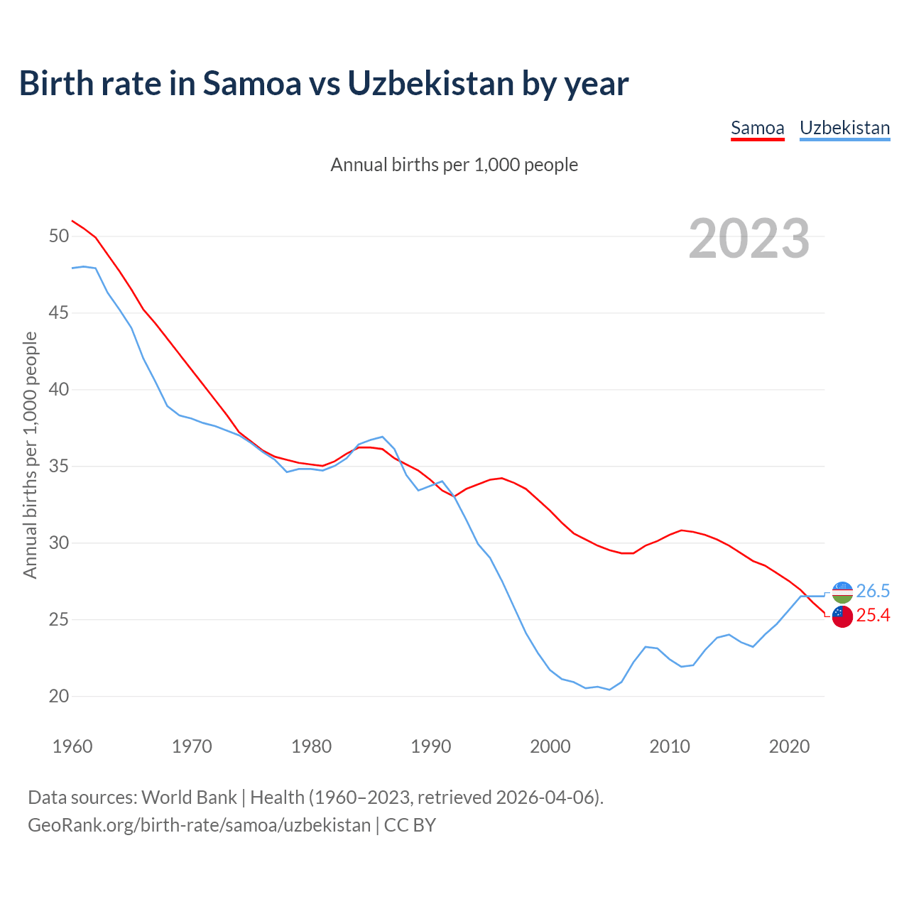 Samoa has an annual birth rate of 25.4 births per 1,000 people, compared to 26.5 for Uzbekistan. The average number of children a woman is expected to have during her lifetime — the fertility rate, is 3.83 in Samoa and 3.5 in Uzbekistan — 8.59% difference.