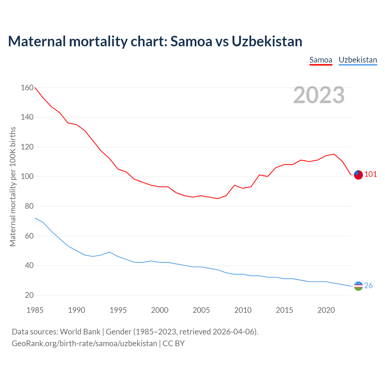 The maternal mortality rate, which is the probability of dying during childbirth or within 42 days of pregnancy termination, is 101 deaths per 100,000 live births in Samoa, compared to 26 deaths in Uzbekistan.