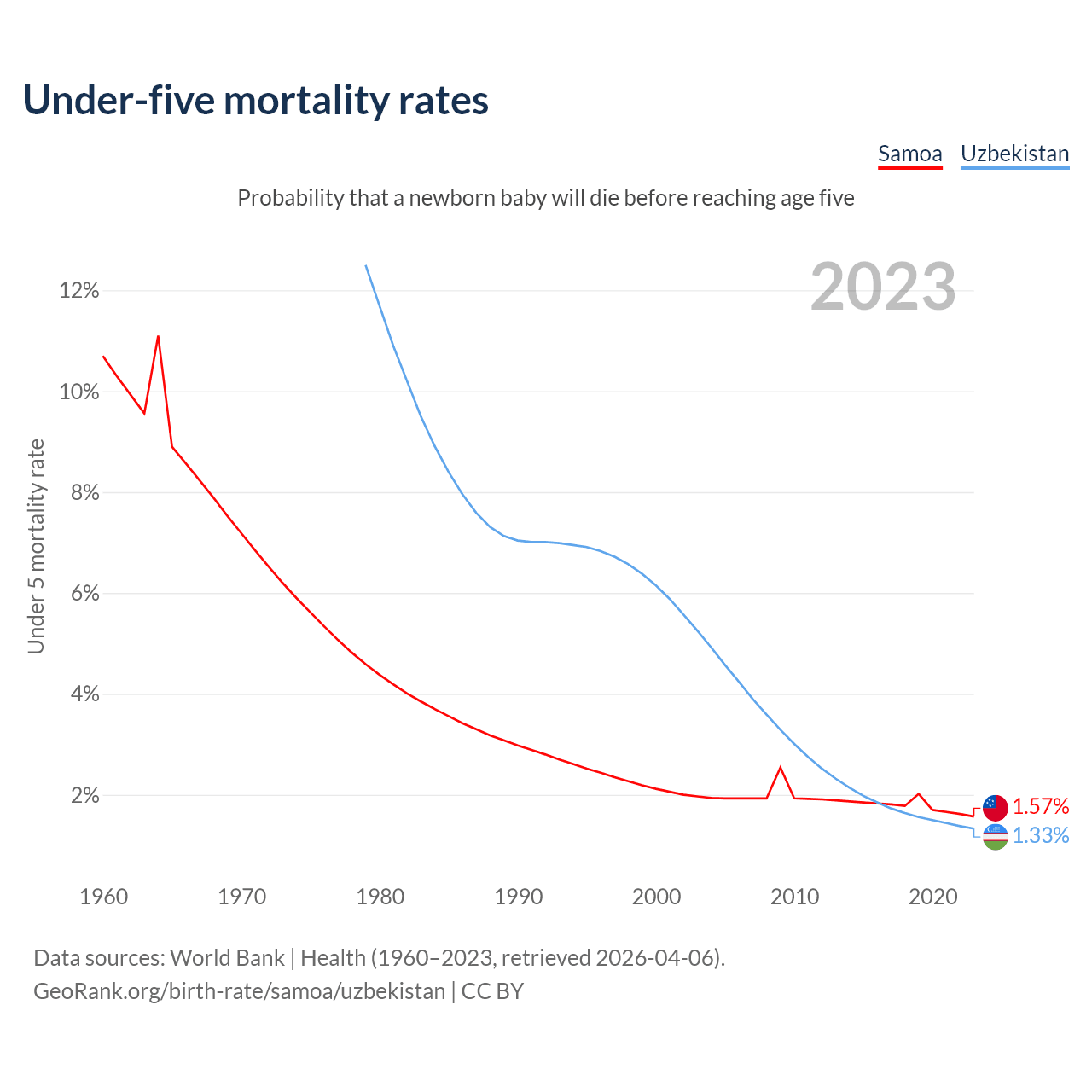 The chance that a newborn baby will die before reaching age five is 1.57% in Samoa and 1.33% in Uzbekistan. Above is a chart with historical data on under-five mortality rates.