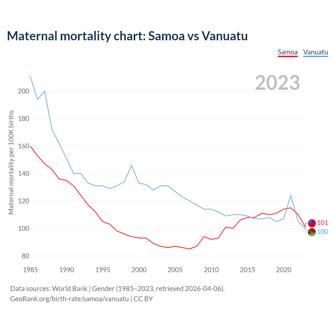 The maternal mortality rate, which is the probability of dying during childbirth or within 42 days of pregnancy termination, is 101 deaths per 100,000 live births in Samoa, compared to 100 deaths in Vanuatu.