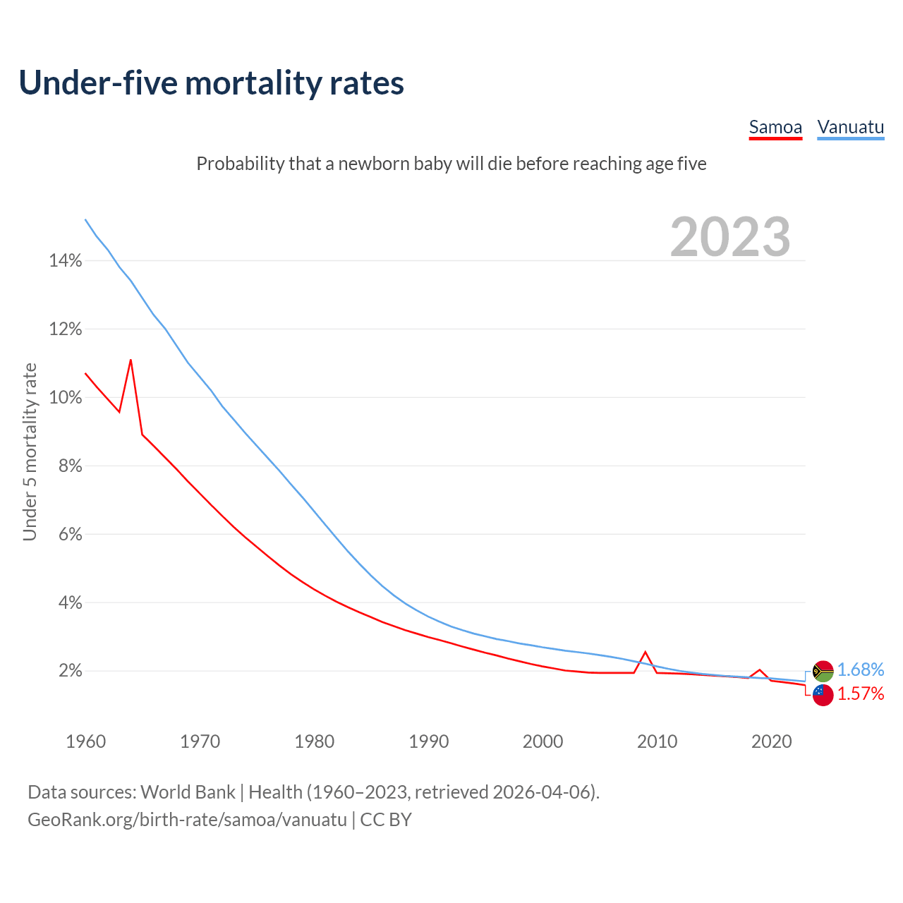 The chance that a newborn baby will die before reaching age five is 1.57% in Samoa and 1.68% in Vanuatu. Above is a chart with historical data on under-five mortality rates.